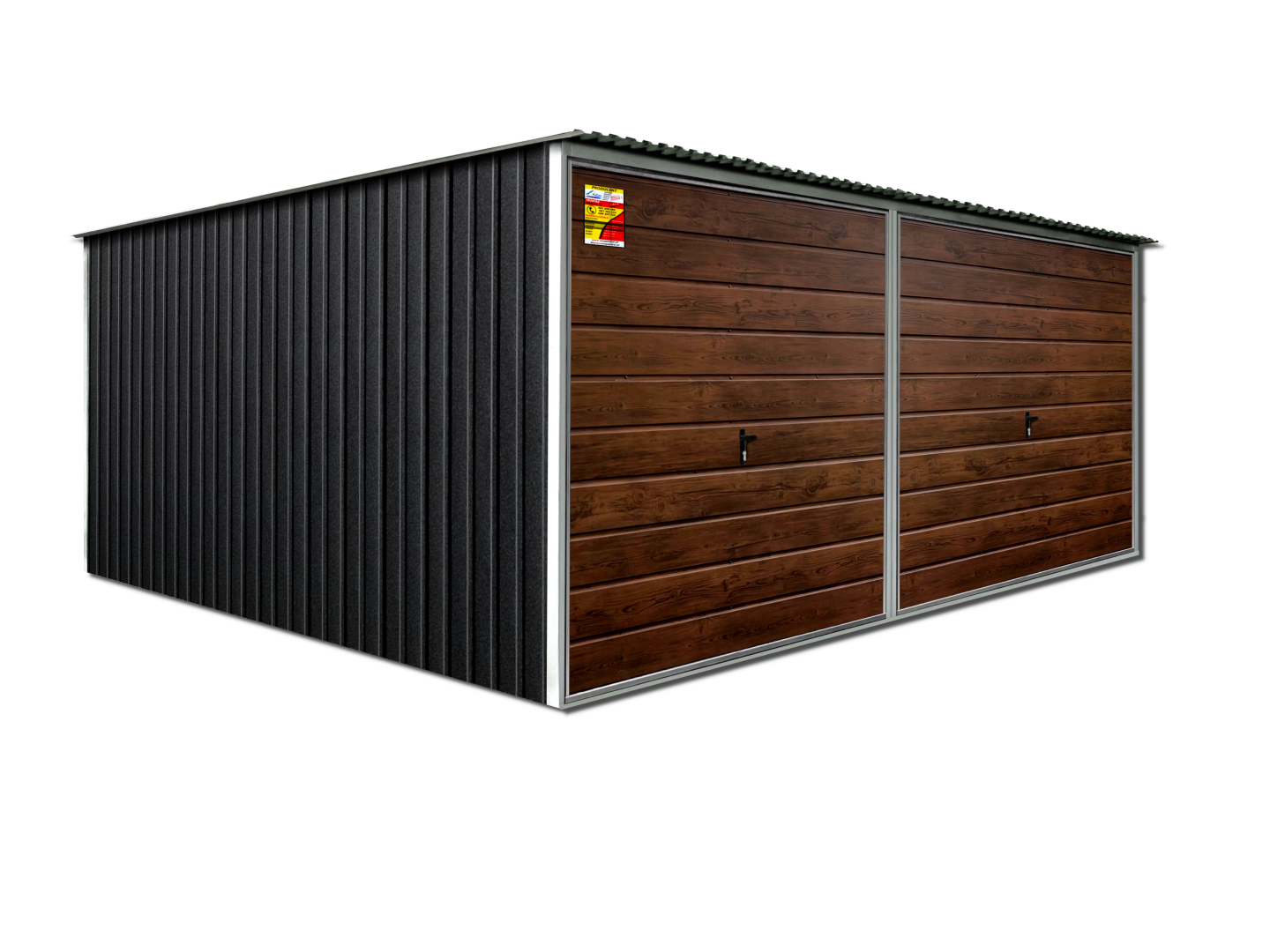 GARAŻ LUX 6X5 – SPAD DACHU DO TYŁU, DREWNOPODOBNE BRAMY UCHYLNE, KONSTRUKCJA OCYNKOWANA