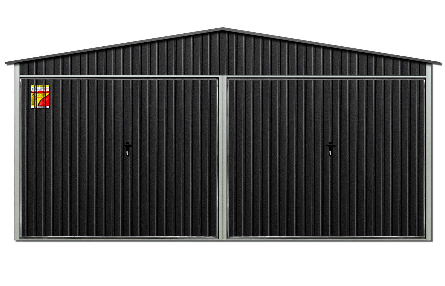 GRAFITOWY GARAŻ BLASZANY 6X6 – DWUSPADOWY DACH, BRAMY UCHYLNE, KONSTRUKCJA OCYNKOWANA