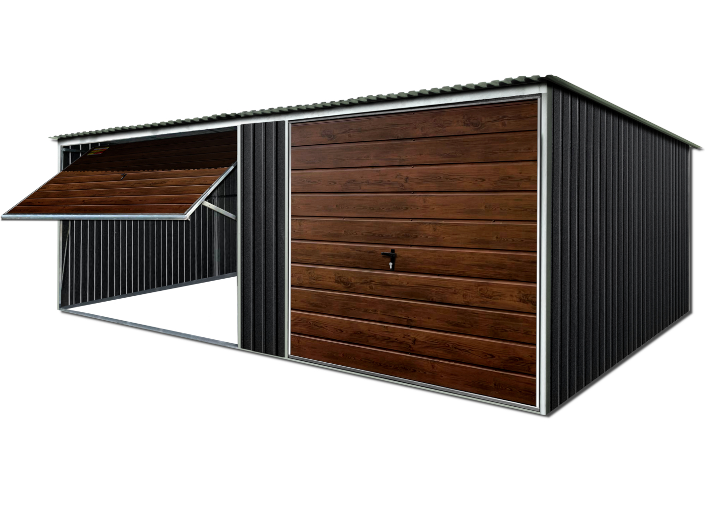 Garaż blaszany 7X6 LUX – Dwuspadowy dach, bramy uchylne, grafit mat