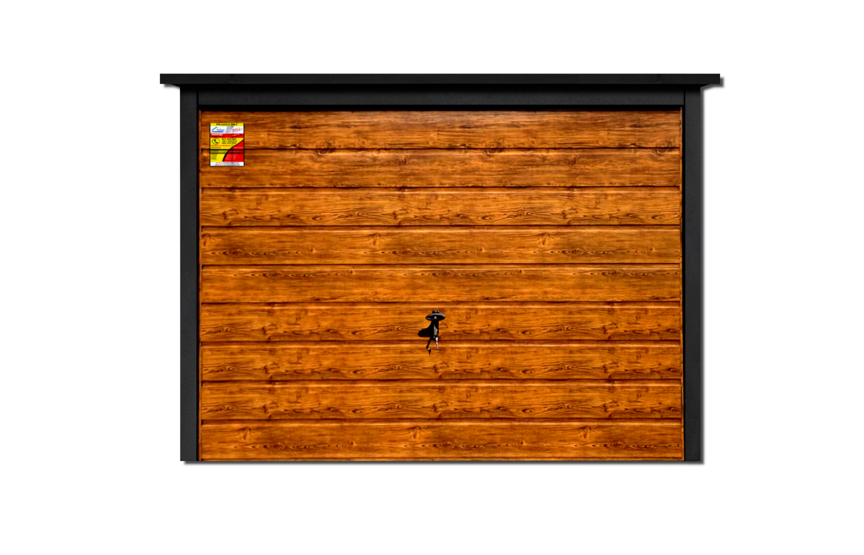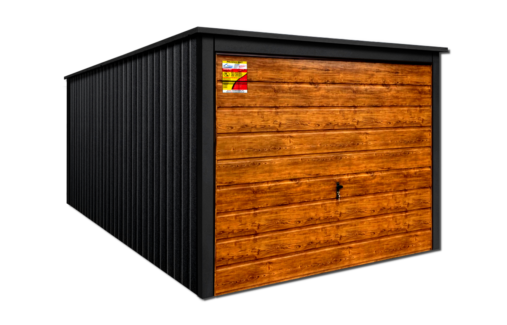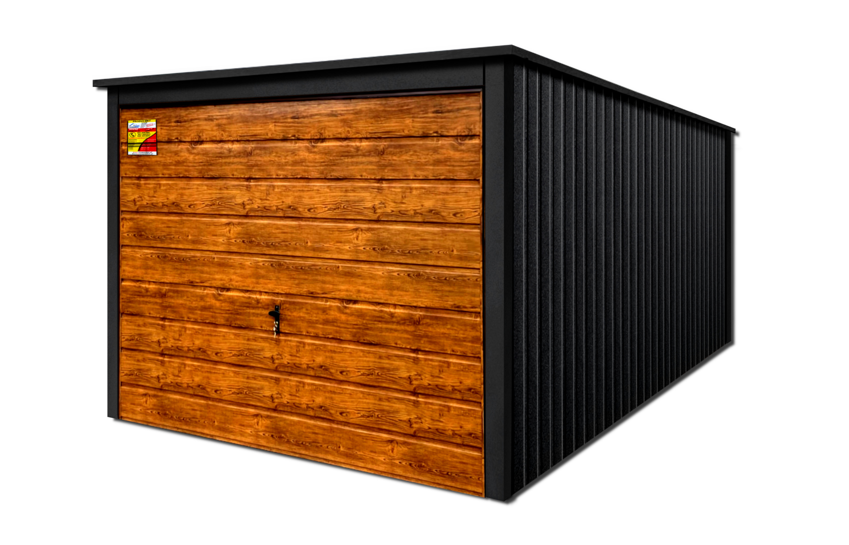 Garaż blaszany 4X6 LUX drewnopodobny – Dwuspadowy dach, brama uchylna