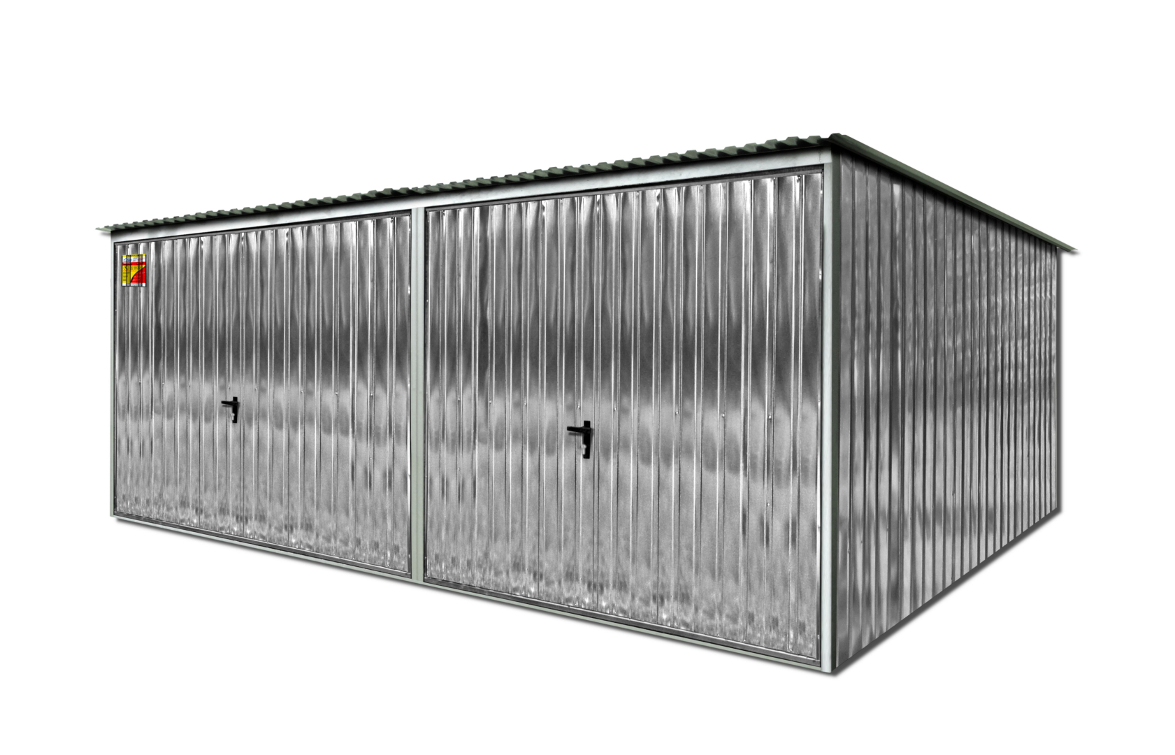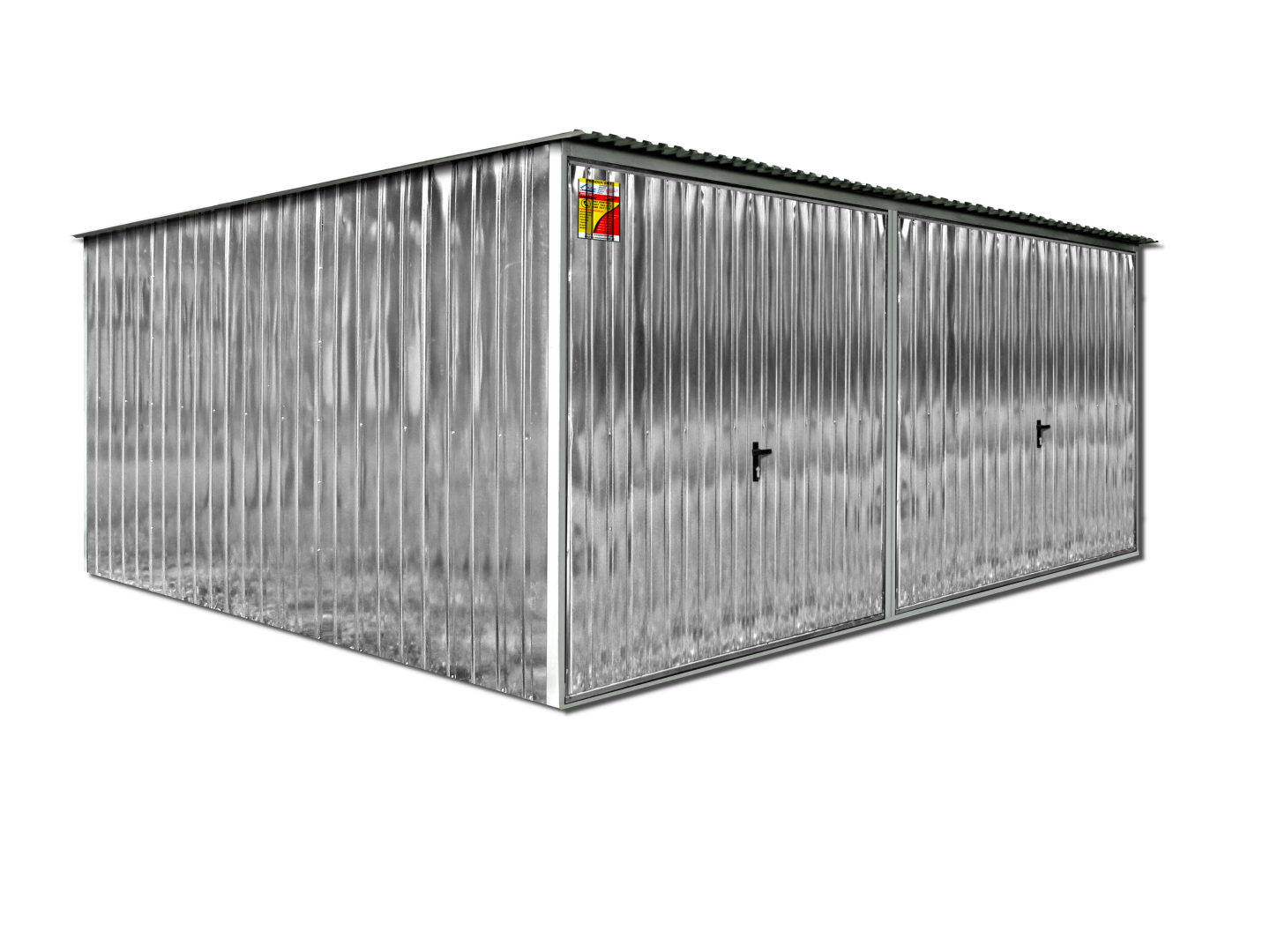 Garaż blaszany 7X7 ocynkowany – Spad dachu do tyłu, bramy dwuskrzydłowe