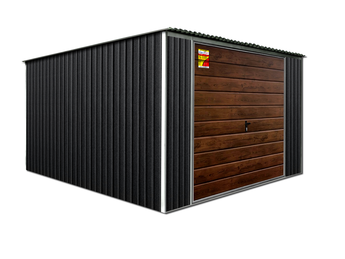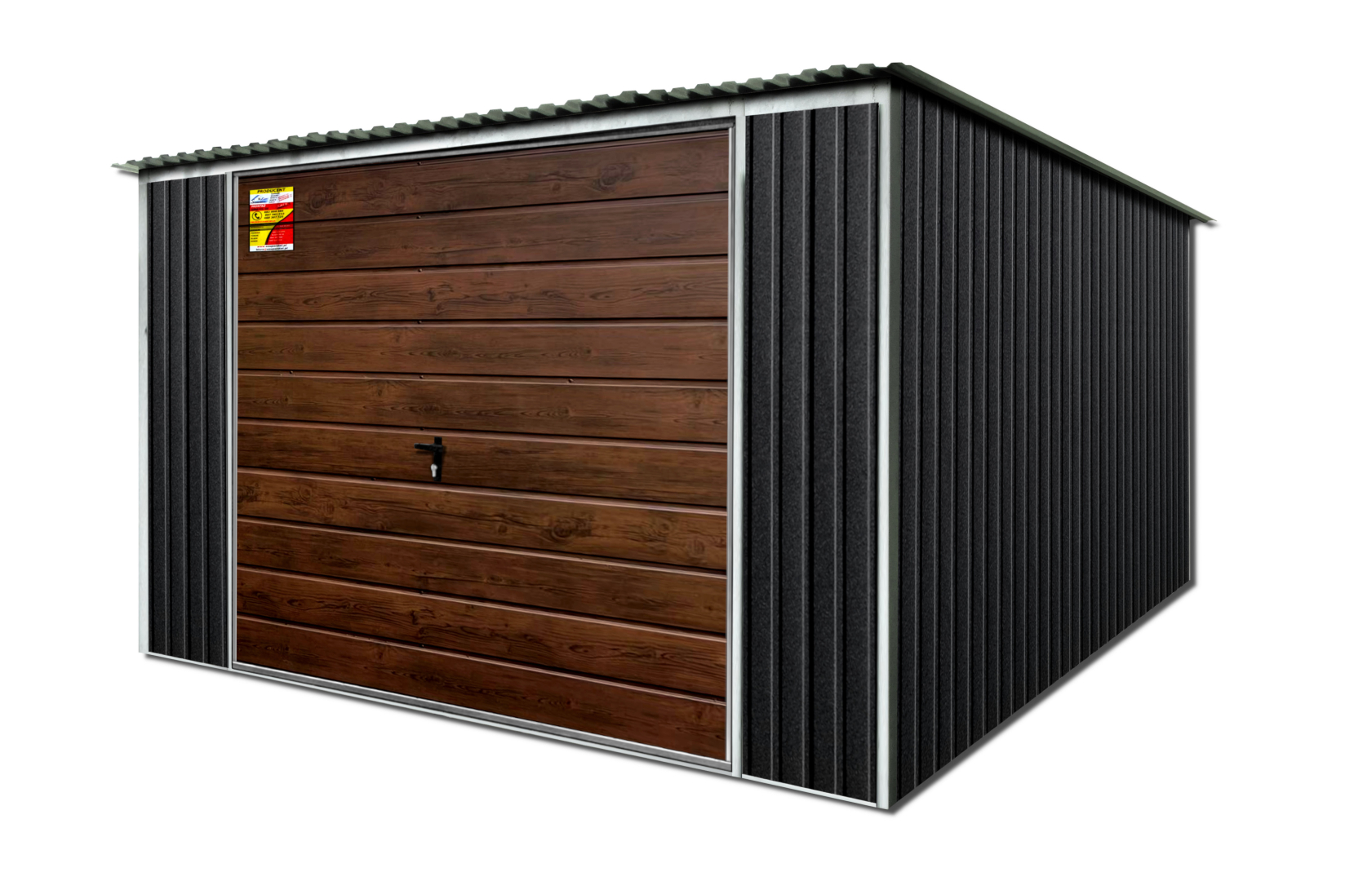 Garaż blaszany 5X7 LUX drewnopodobny – Dwuspadowy dach, brama uchylna