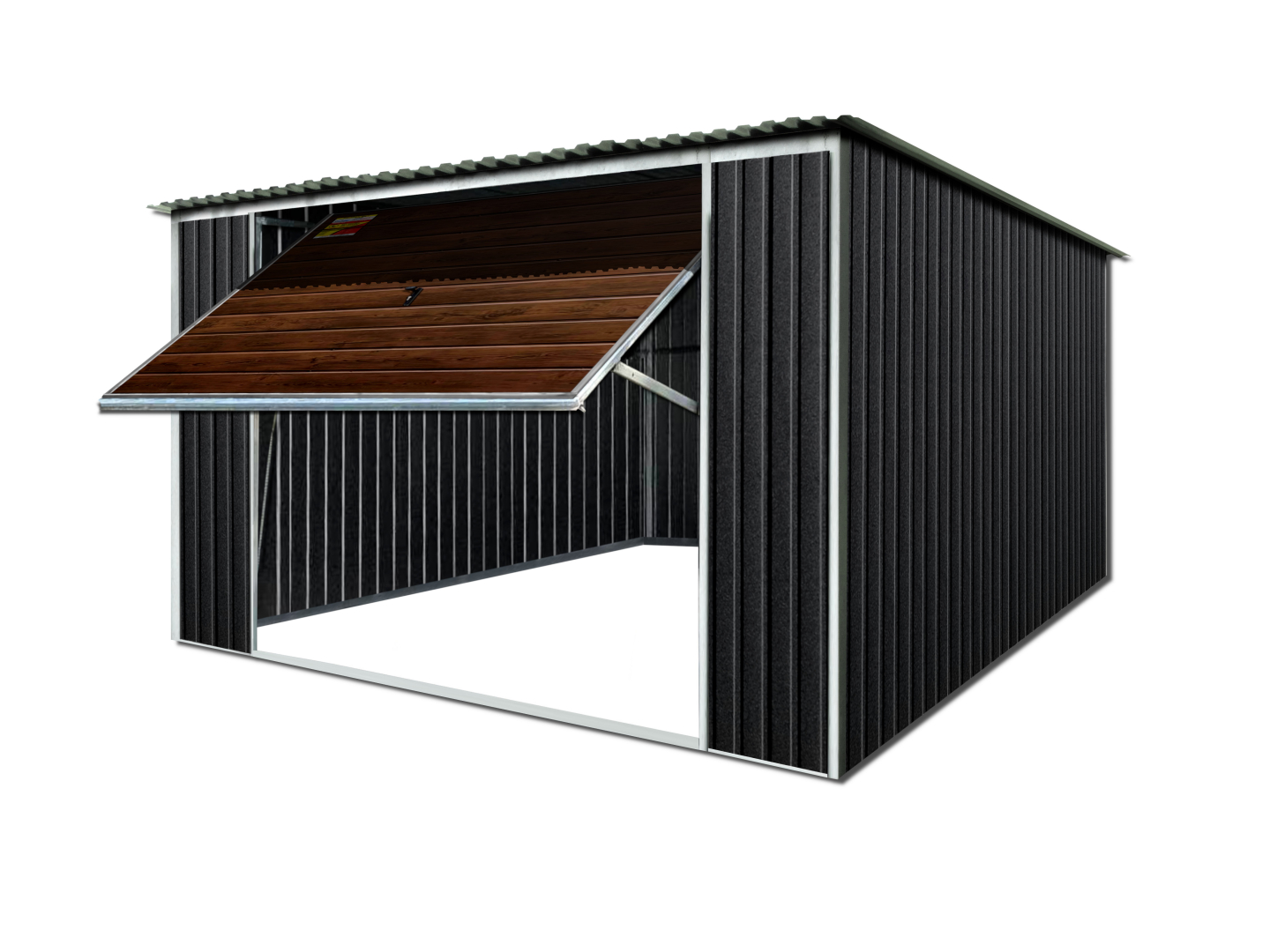 Garaż blaszany 2X6 LUX – Spad dachu do tyłu, brama uchylna, grafit mat