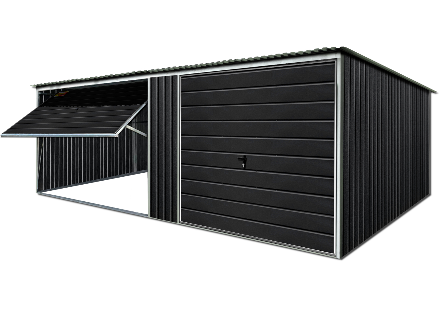 Garaż blaszany 4X4 LUX – Spad dachu do tyłu, brama uchylna, drzwi, grafit mat