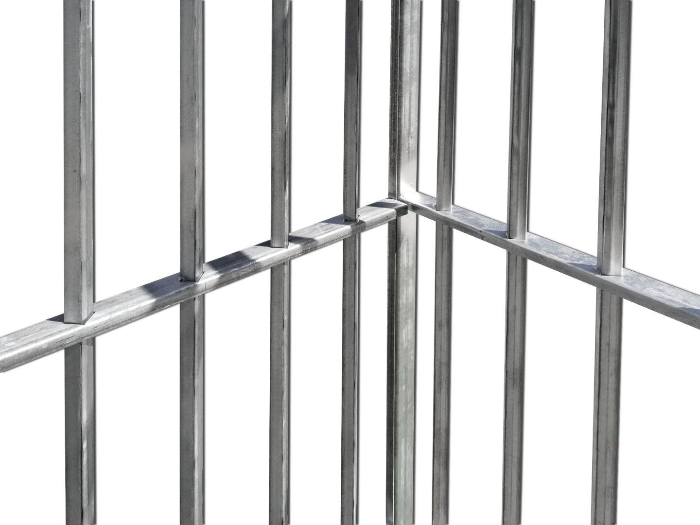 Konstrukcja z profilu ocynkowanego – kojec wykonany z kwadratowych profili ocynkowanych, zawijanych-niezgrzewanych o wymiarze 20x20 mm. Dodatkowo kojec posiada wzmocnienie poziome z ceownika ocynkowanego. Odstępy między profilami wynoszą około 8,5 cm.