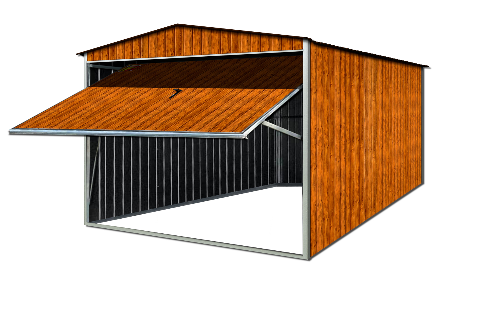 GARAŻ BLASZANY DREWNOPODOBNY 2X6 – DWUSPADOWY DACH, BRAMA UCHYLNA, KONSTRUKCJA OCYNKOWANA