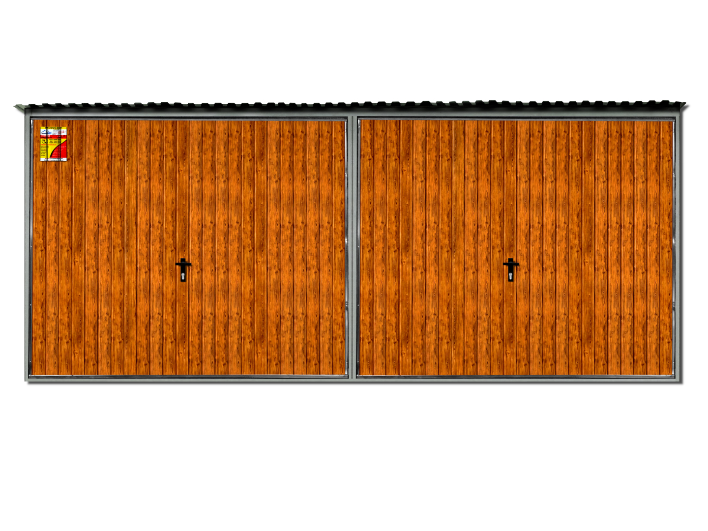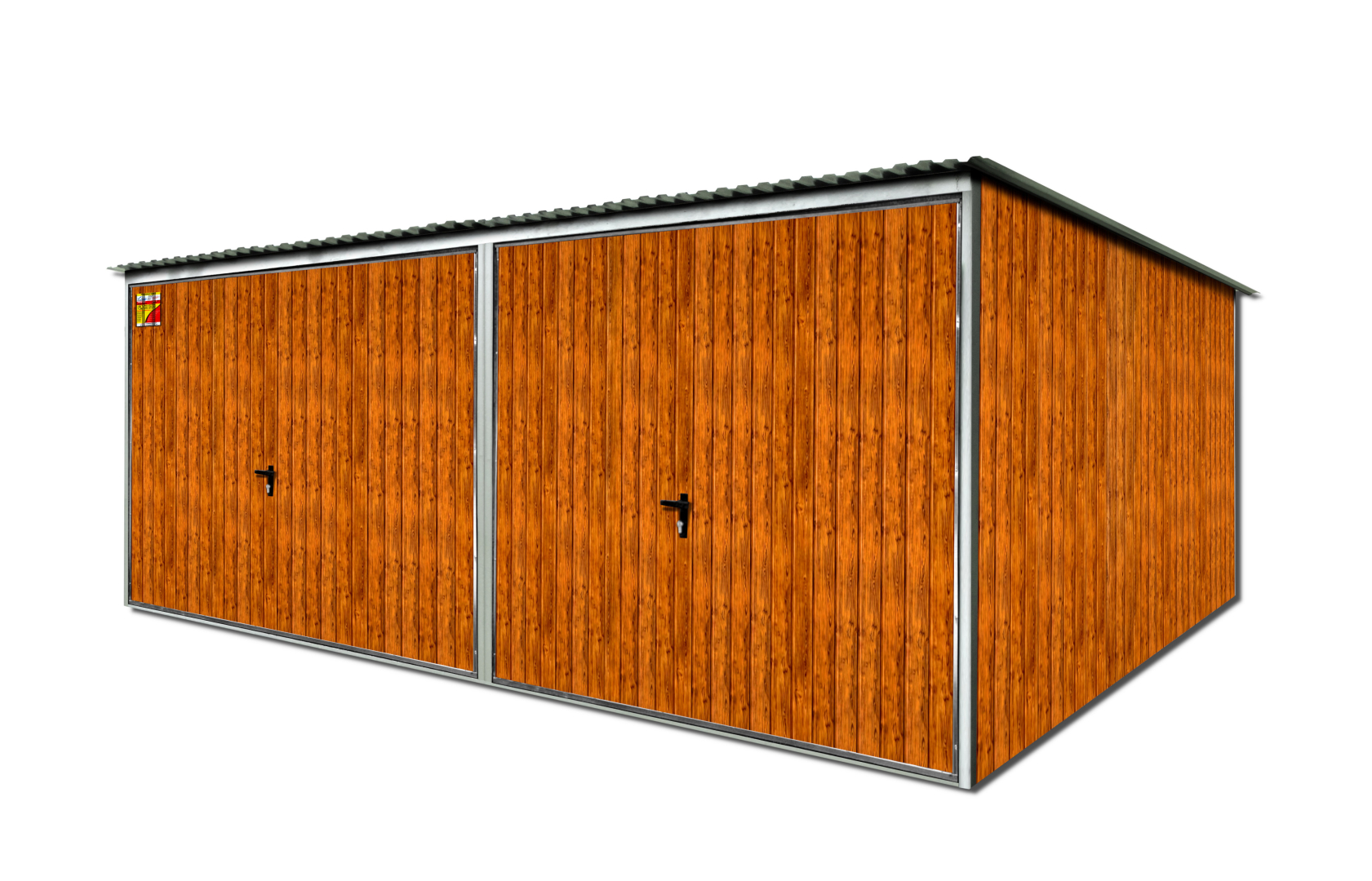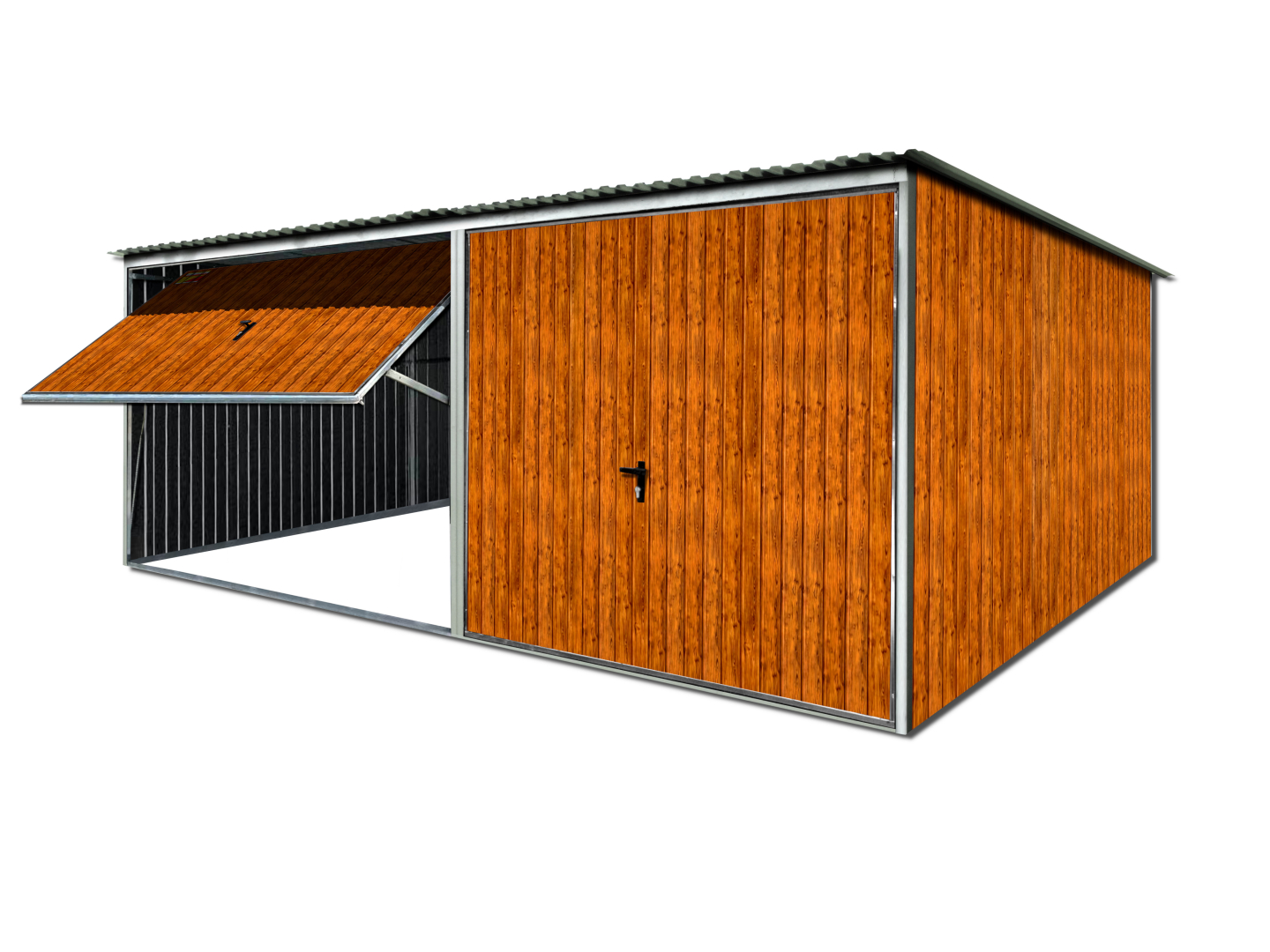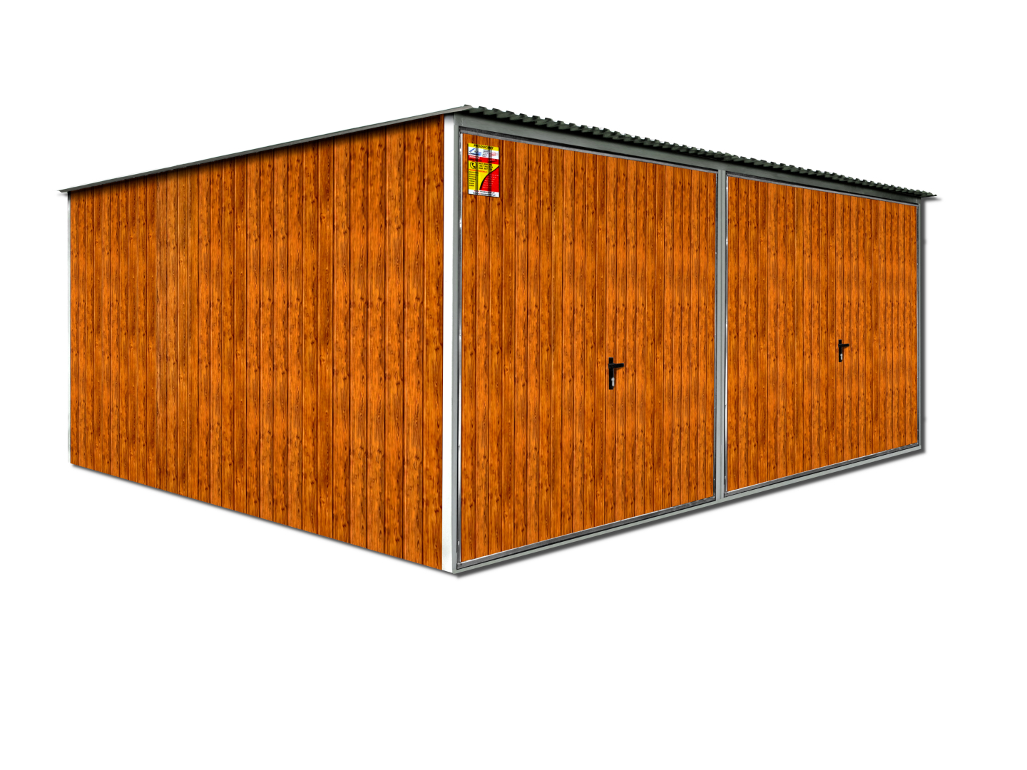 Kup teraz!Garaż blaszany drewnopodobny 7X6 – Dwuspadowy dach, bramy uchylne