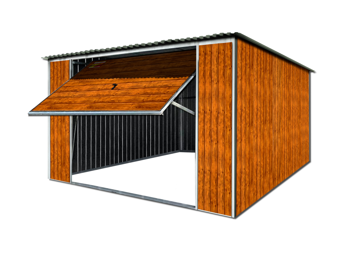 GARAŻ LUX 4X8 DREWNOPODOBNY – SPAD DACHU DO TYŁU, BRAMA UCHYLNA, KONSTRUKCJA OCYNKOWANA