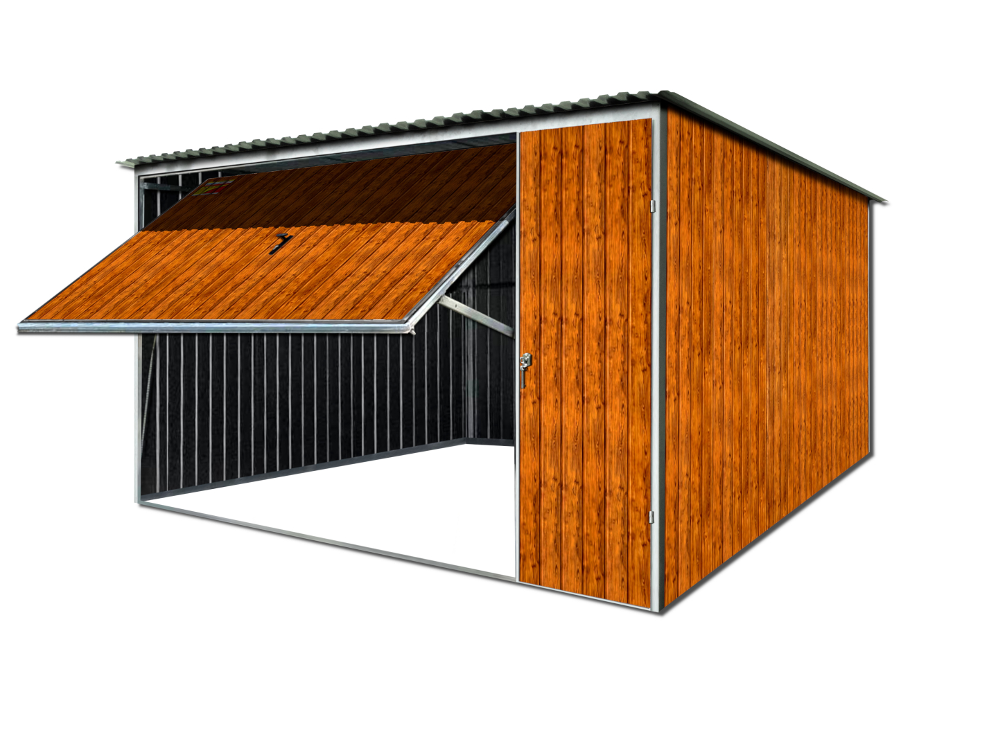 GARAŻ BLASZANY DREWNOPODOBNY 4X6 – SPAD DACHU DO TYŁU, BRAMA UCHYLNA, DRZWI, KONSTRUKCJA OCYNKOWANA