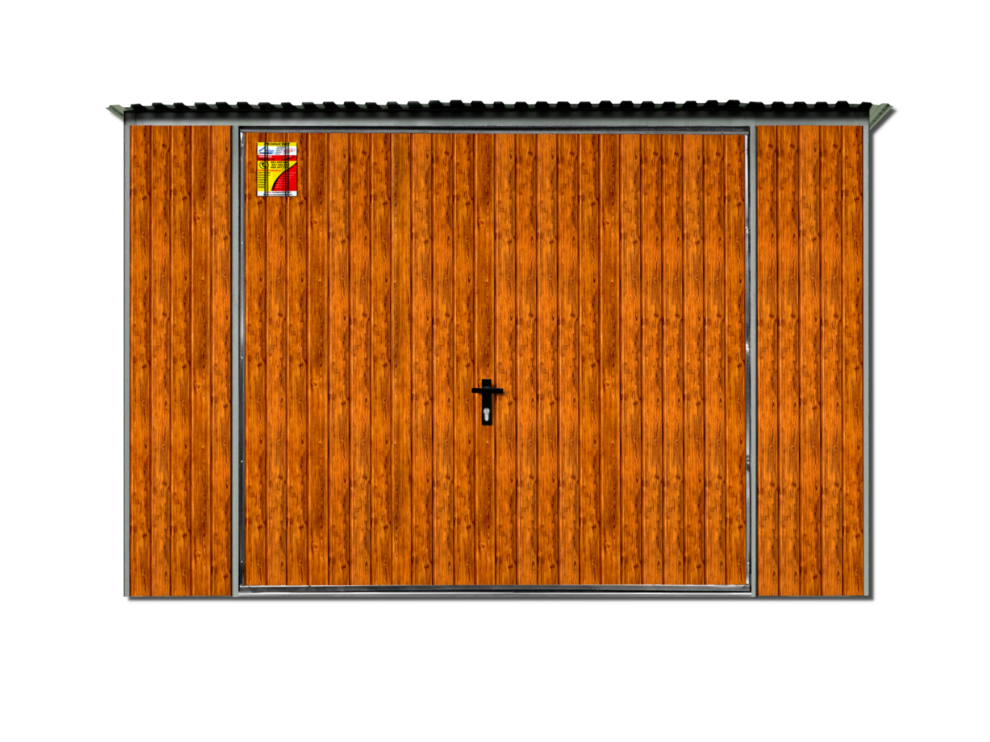 Garaż blaszany drewnopodobny 3X3 – Dwuspadowy dach, brama dwuskrzydłowa
