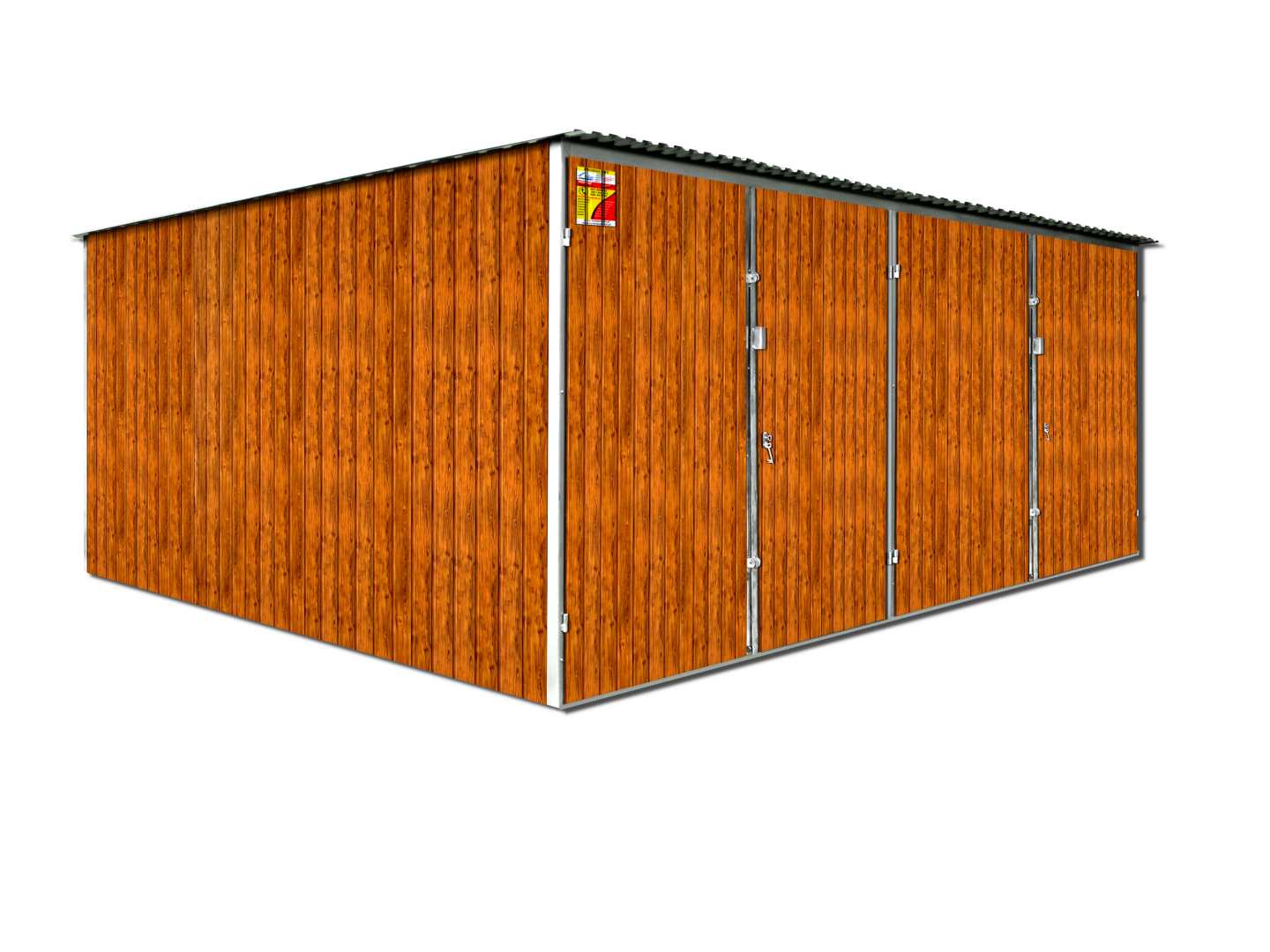 GARAŻ BLASZANY DREWNOPODOBNY 6X6 – SPAD DACHU DO TYŁU, BRAMY DWUSKRZYDŁOWE, KONSTRUKCJA OCYNKOWANA
