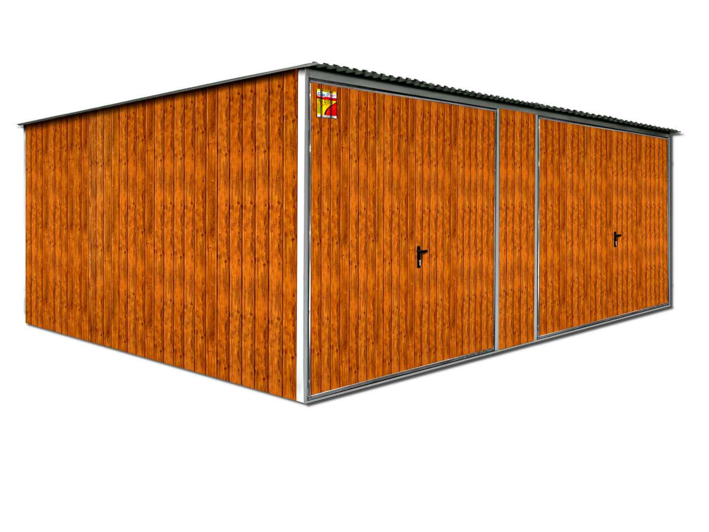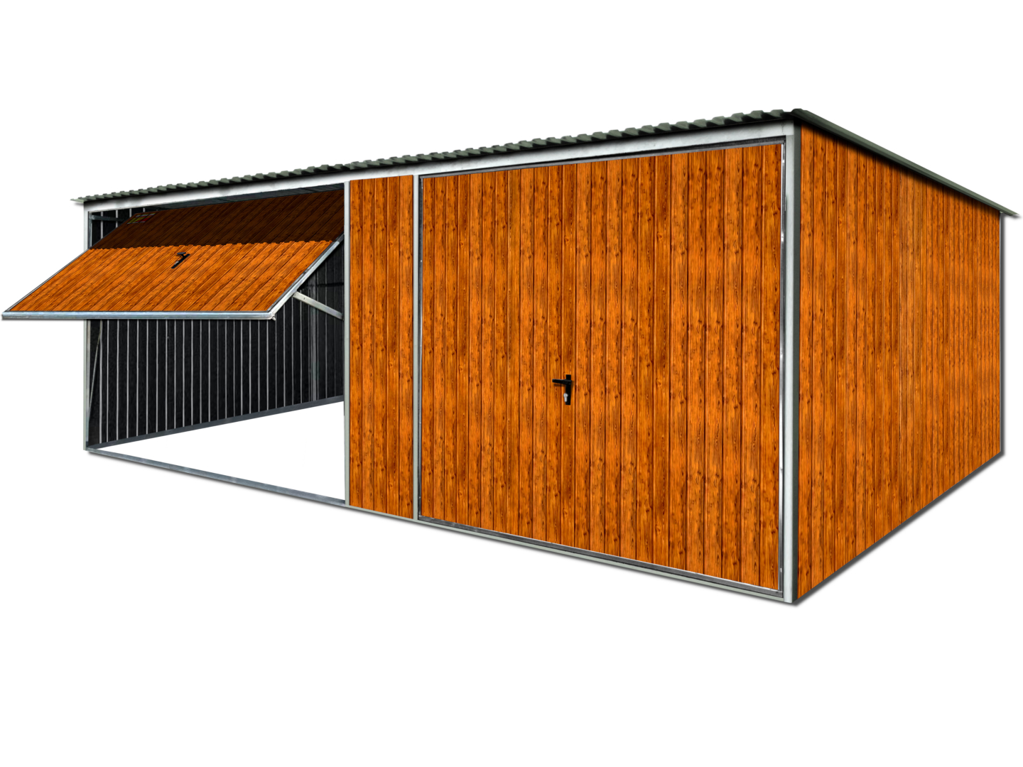 GARAŻ BLASZANY DREWNOPODOBNY 7X6 – SPAD DACHU DO TYŁU, BRAMY UCHYLNE, KONSTRUKCJA OCYNKOWANA