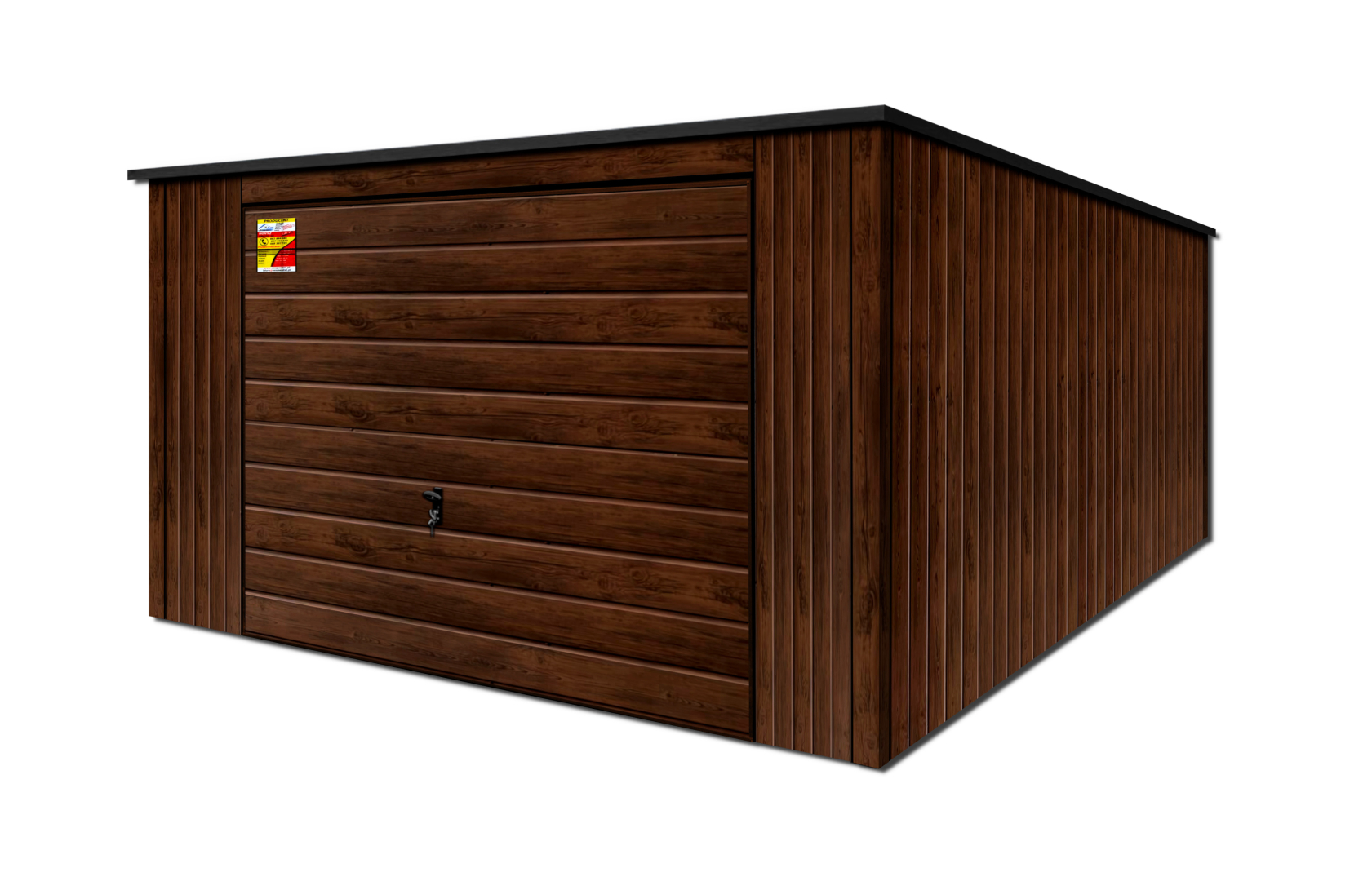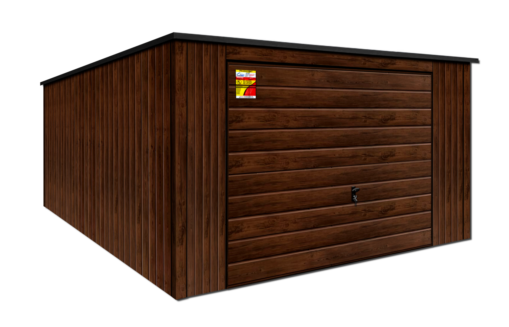 Garaż blaszany 2X5 LUX – Spad dachu do tyłu, drewnopodobna brama uchylna