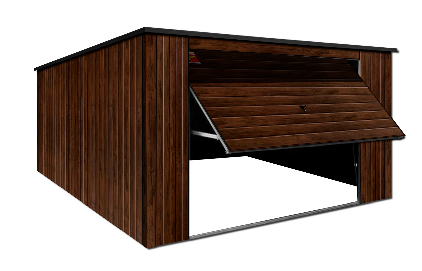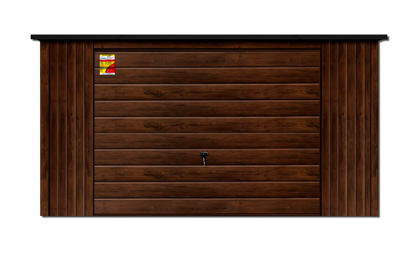 Garaż blaszany 2X3 LUX drewnopodobny – Dwuspadowy dach, brama uchylna