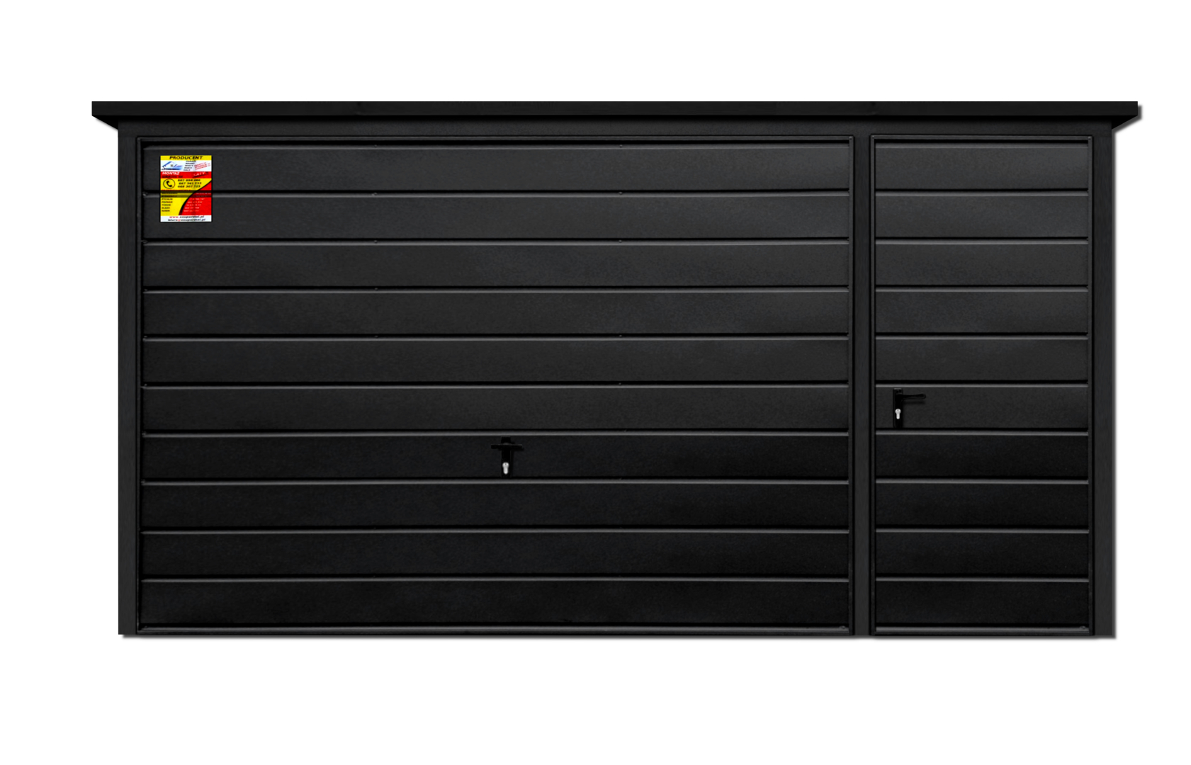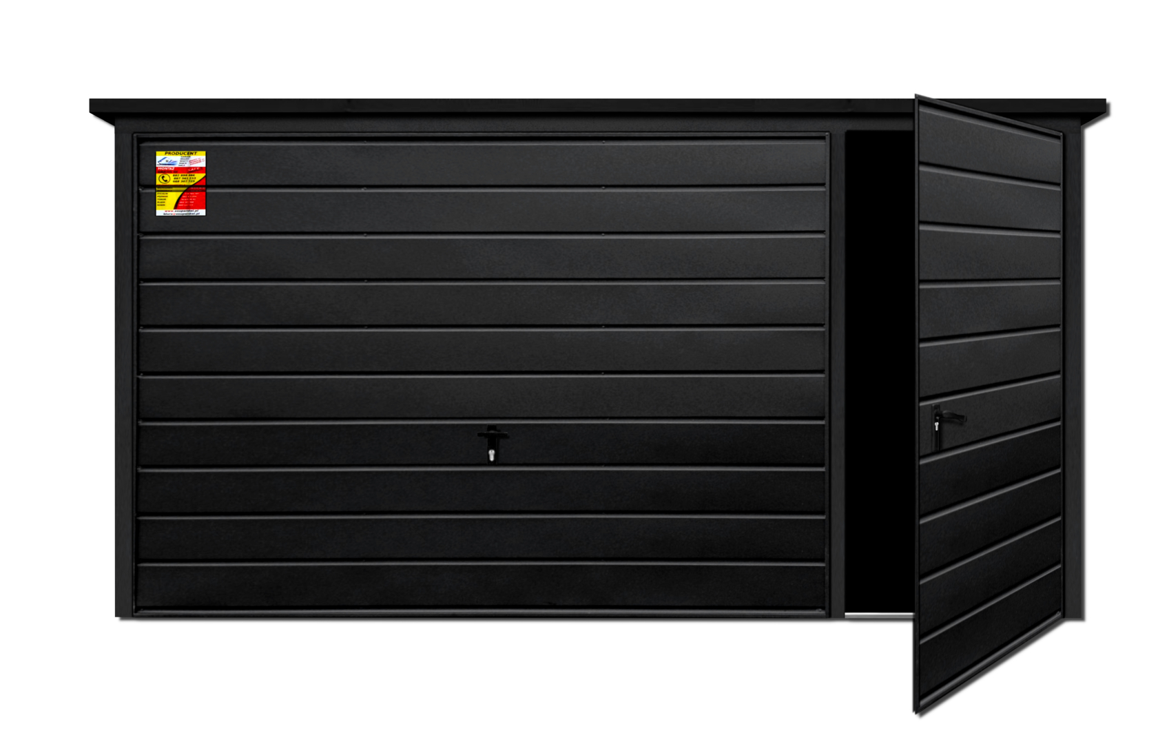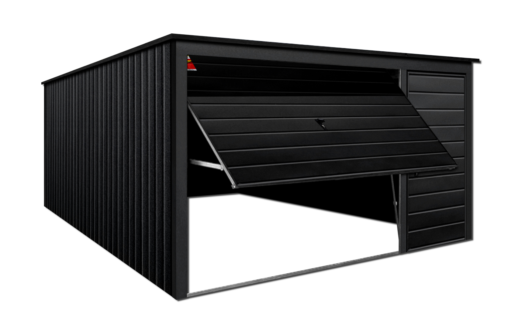 Garaż blaszany 5X4 LUX – Spad dachu do tyłu, brama uchylna, czarny mat