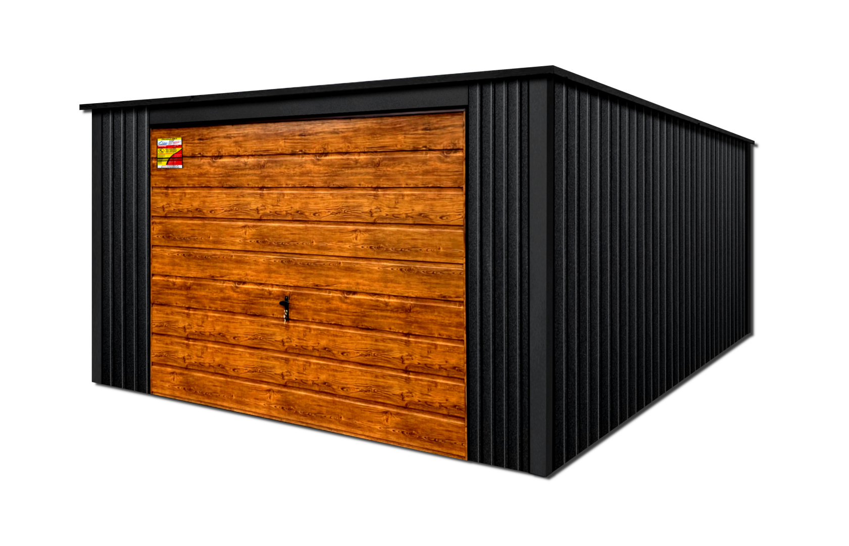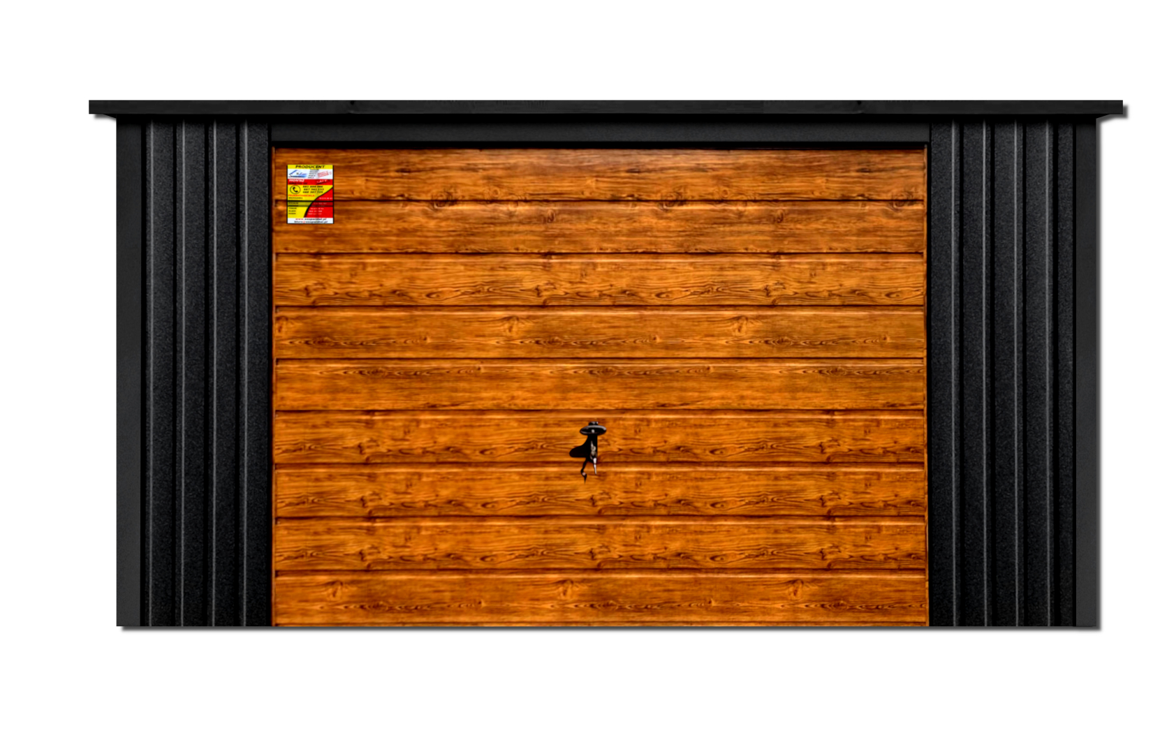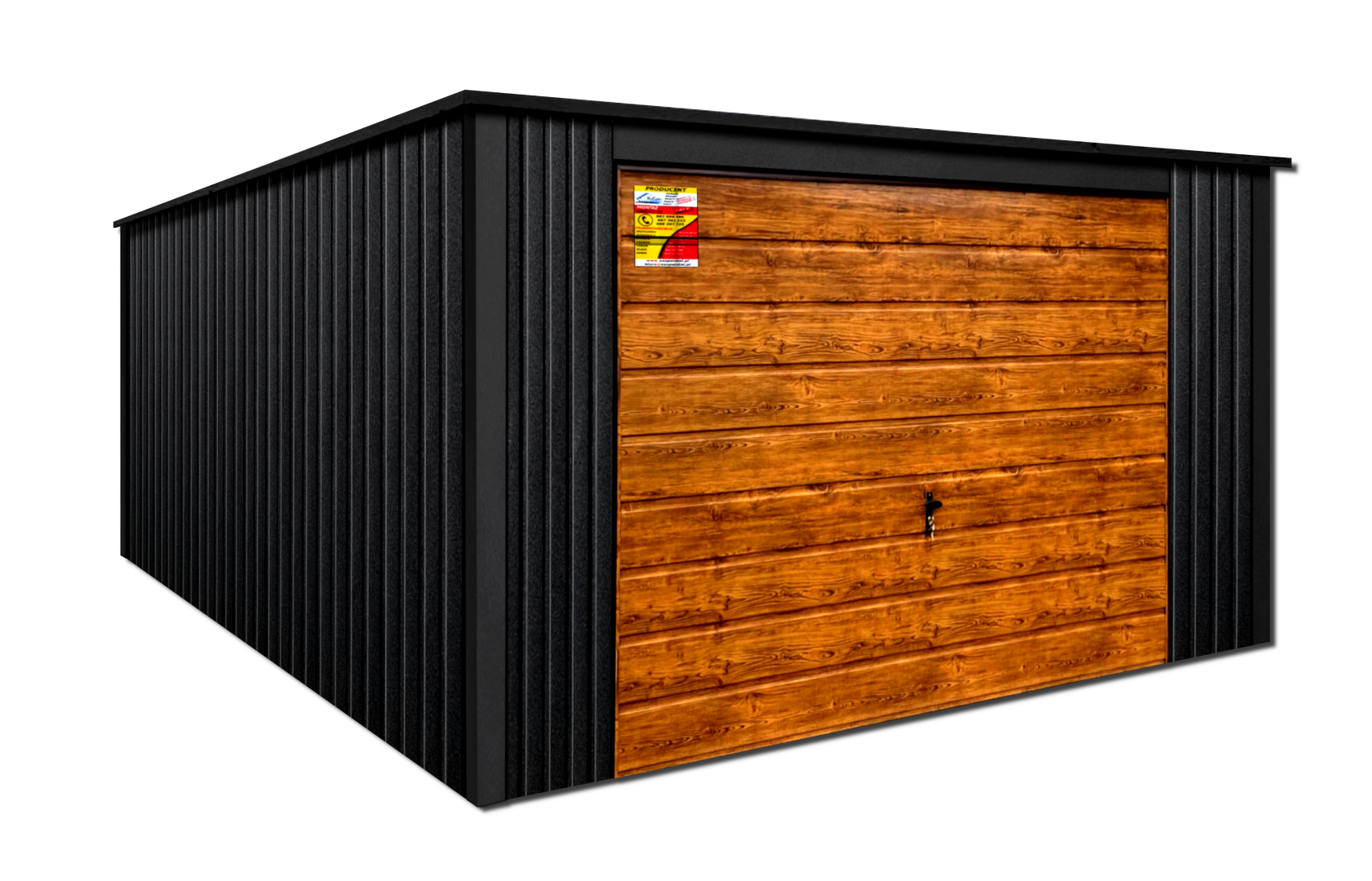 GARAŻ LUX 4X6 – SPAD DACHU DO TYŁU, DREWNOPODOBNA BRAMA UCHYLNA, OKUCIA BLACHARSKIE DACHU I NAROŻNIKÓW