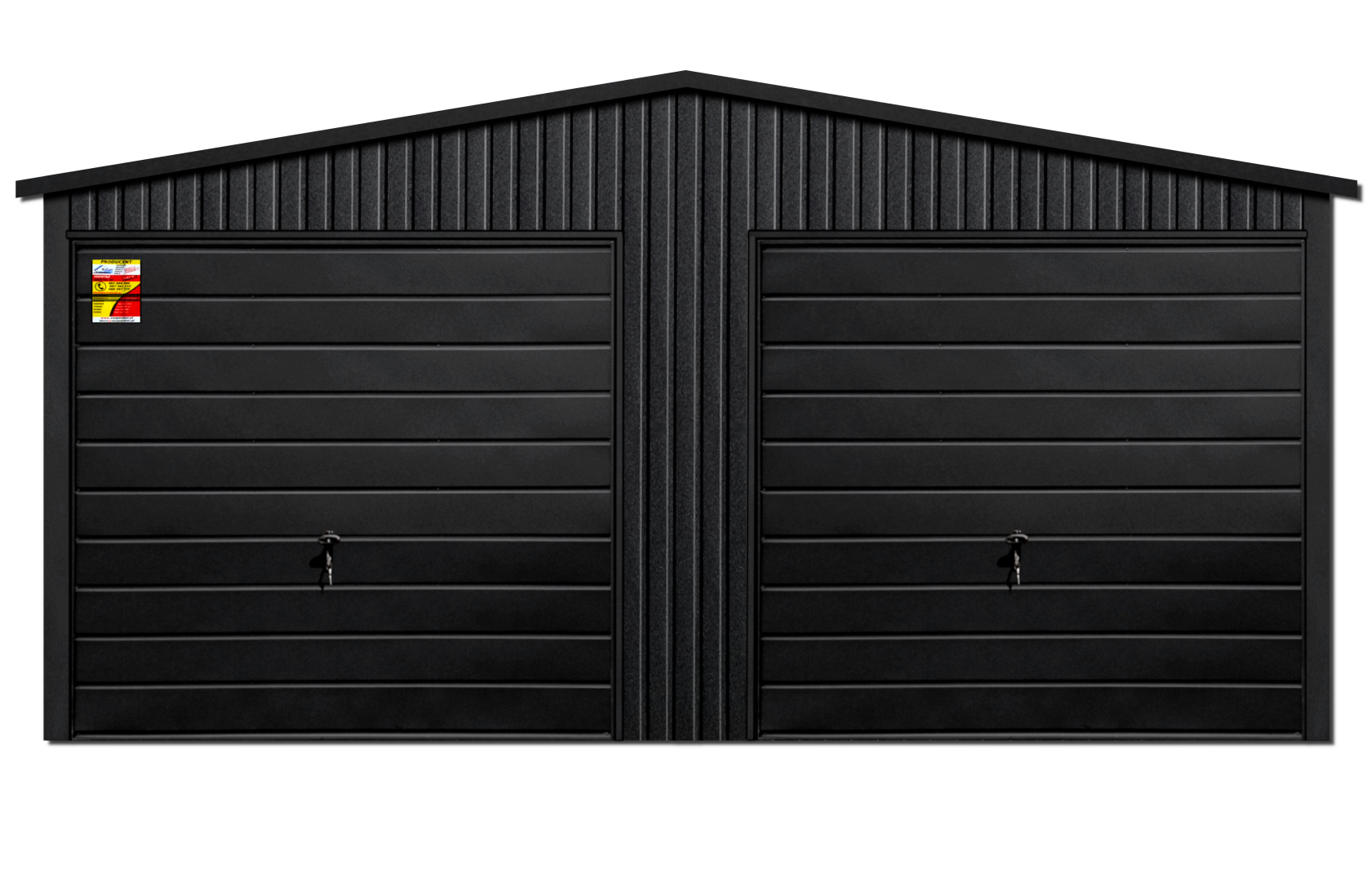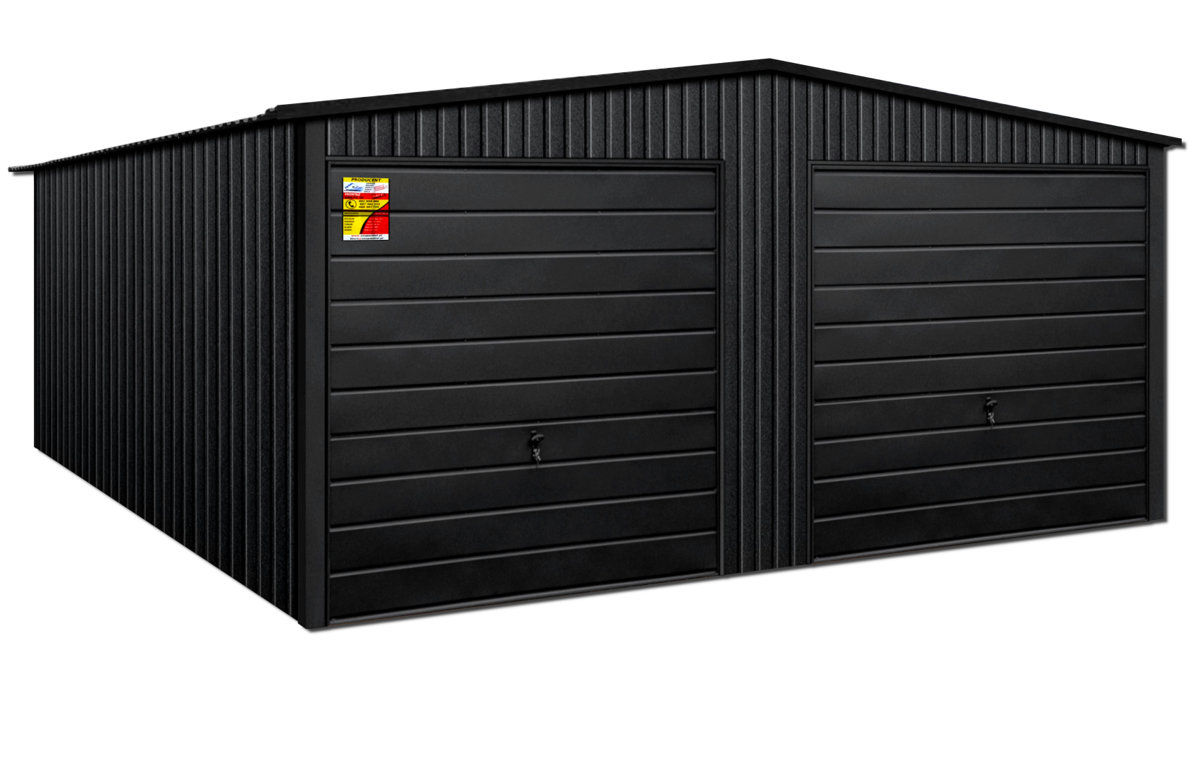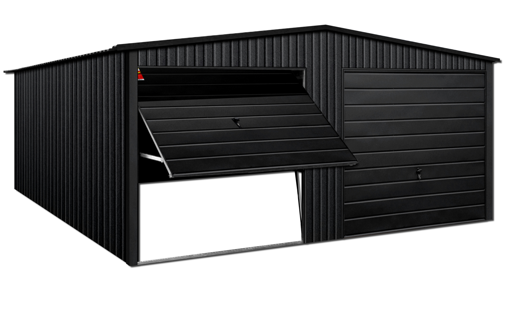 Garaż blaszany 5X6 LUX – Spad dachu do tyłu, brama uchylna, czarny mat