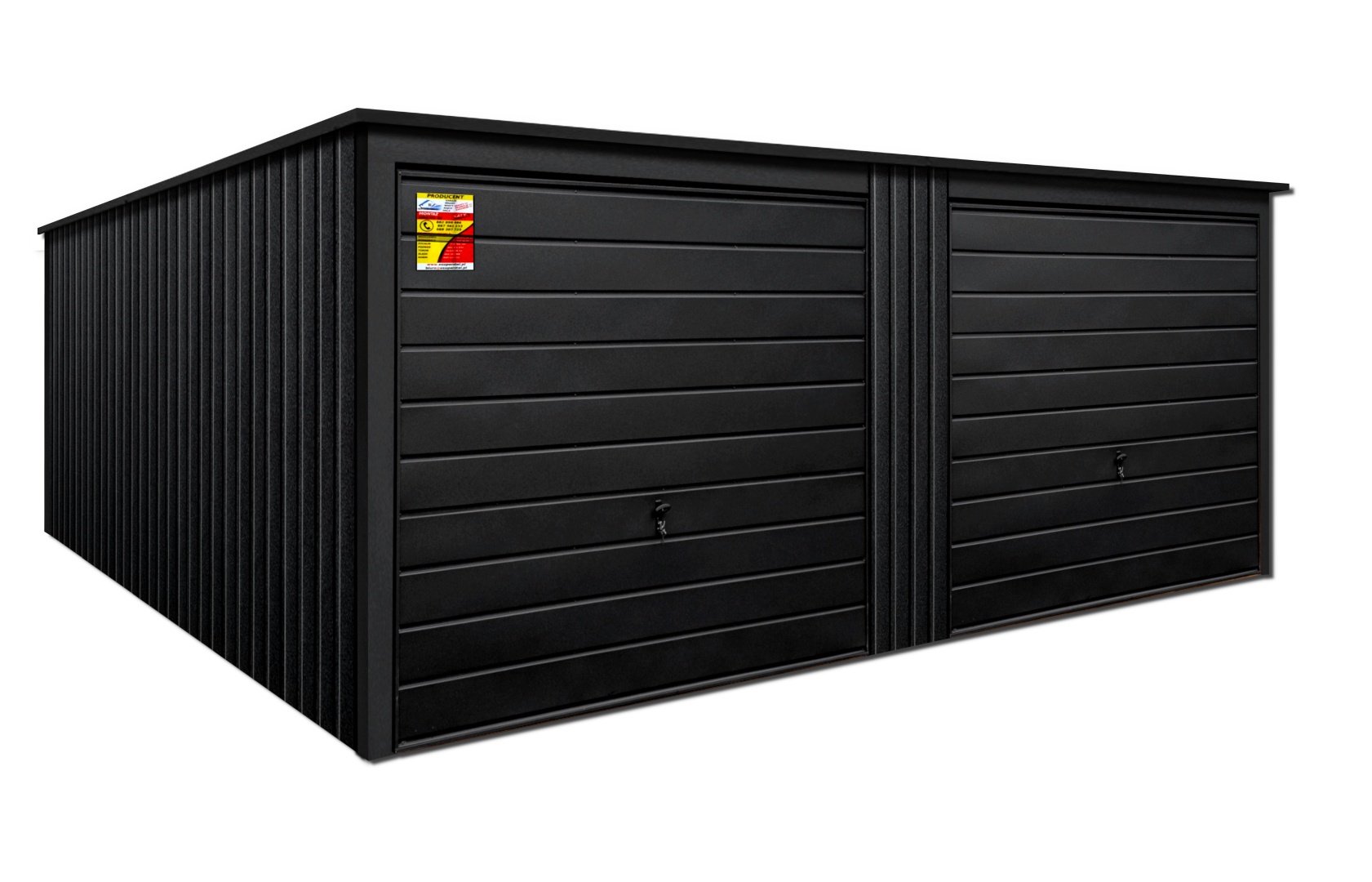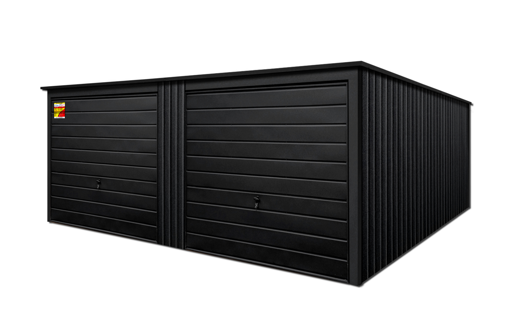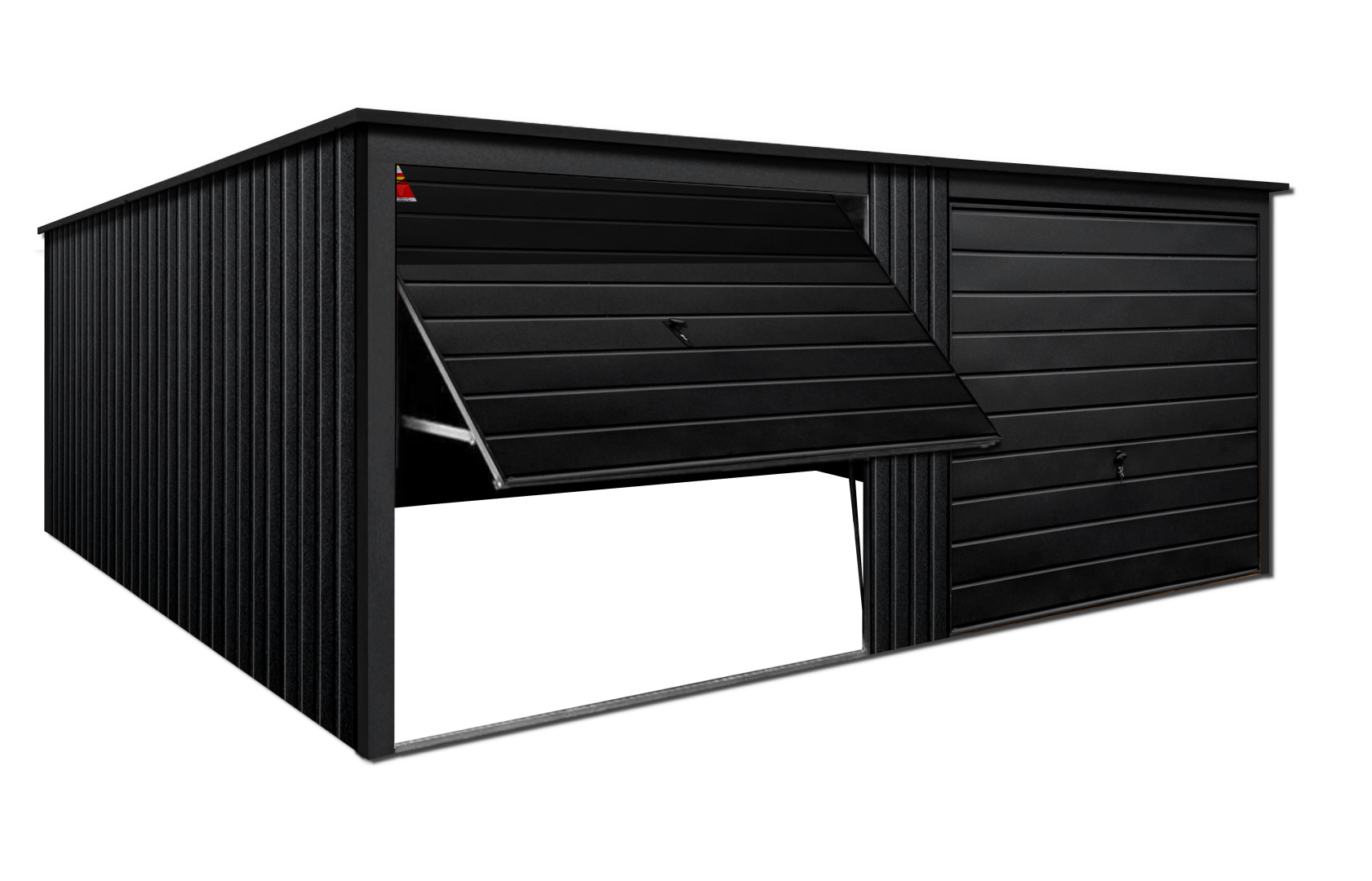 Garaż blaszany 6X8 LUX – Dwuspadowy dach, bramy uchylne, czarny mat