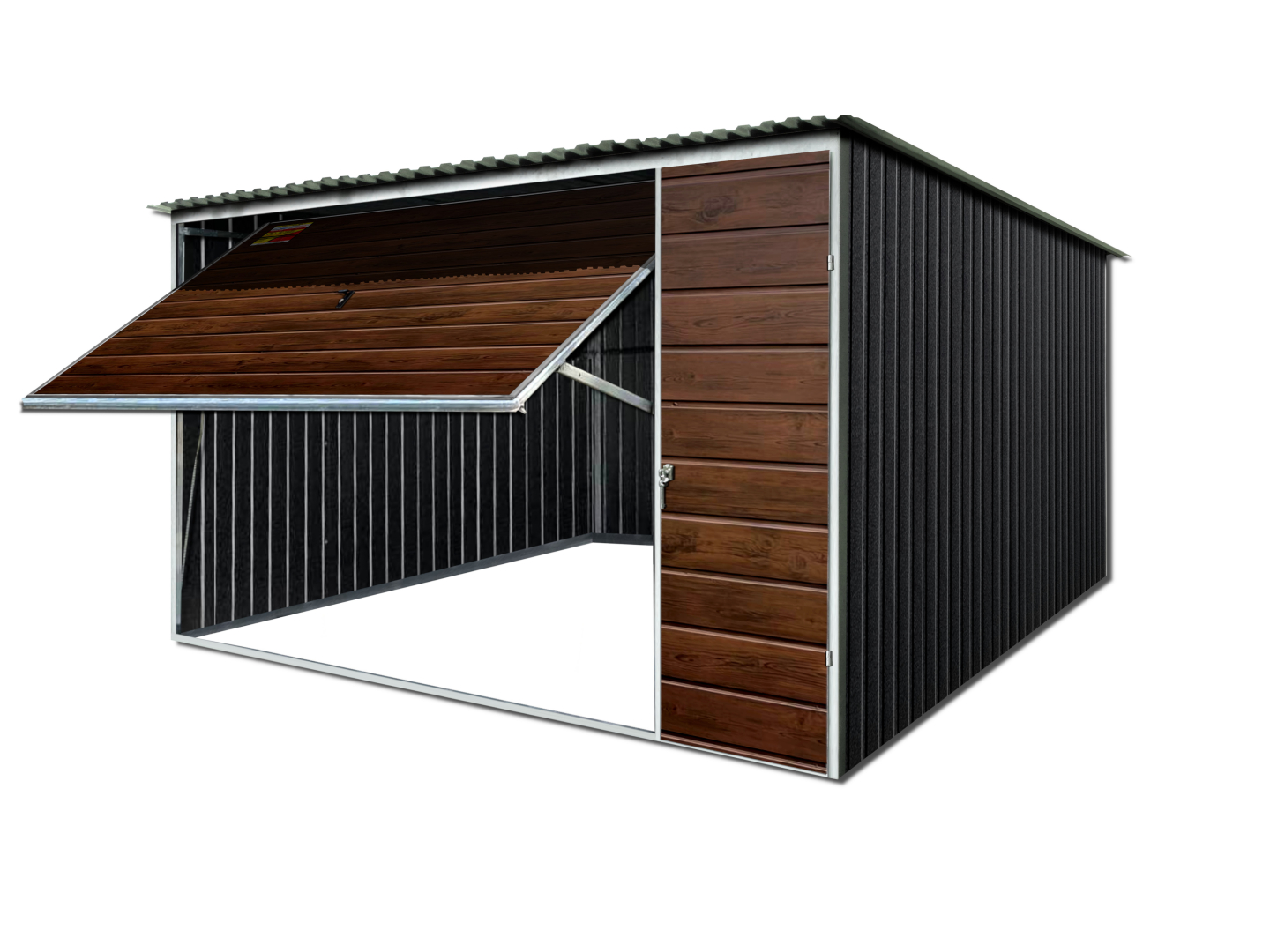 GARAŻ LUX 4X6 – SPAD DACHU DO TYŁU, DREWNOPODOBNA BRAMA UCHYLNA, DRZWI, KONSTRUKCJA OCYNKOWANA