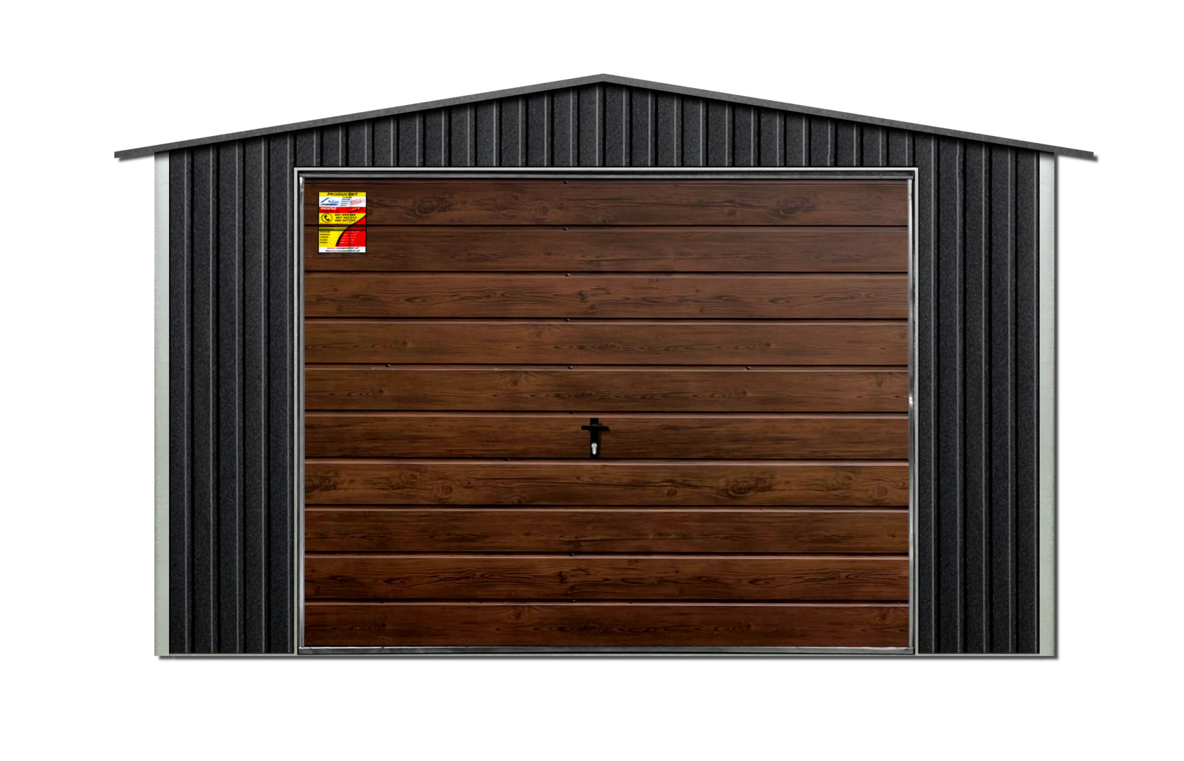 Garaż blaszany 3X7 LUX drewnopodobny – Dwuspadowy dach, brama uchylna