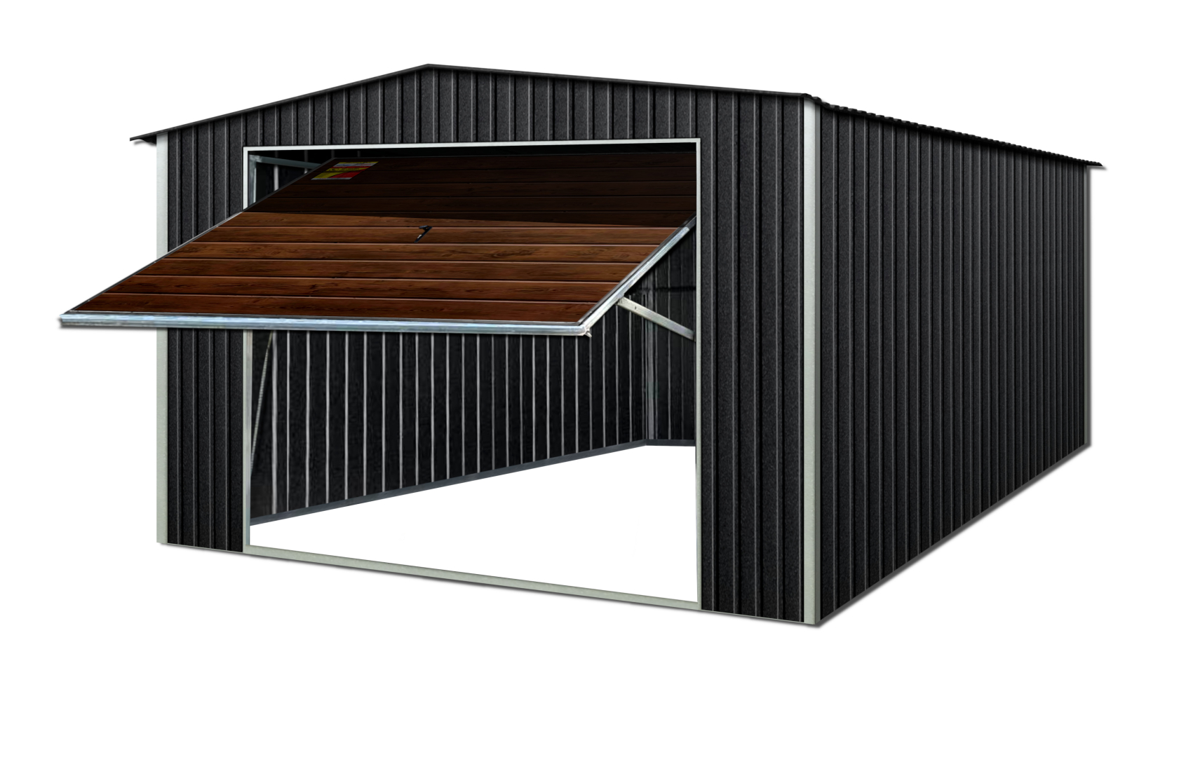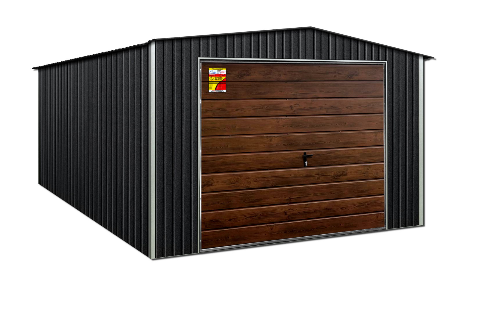 GARAŻ LUX 4X8 – DWUSPADOWY DACH, DREWNOPODOBNA BRAMA UCHYLNA, KONSTRUKCJA OCYNKOWANA