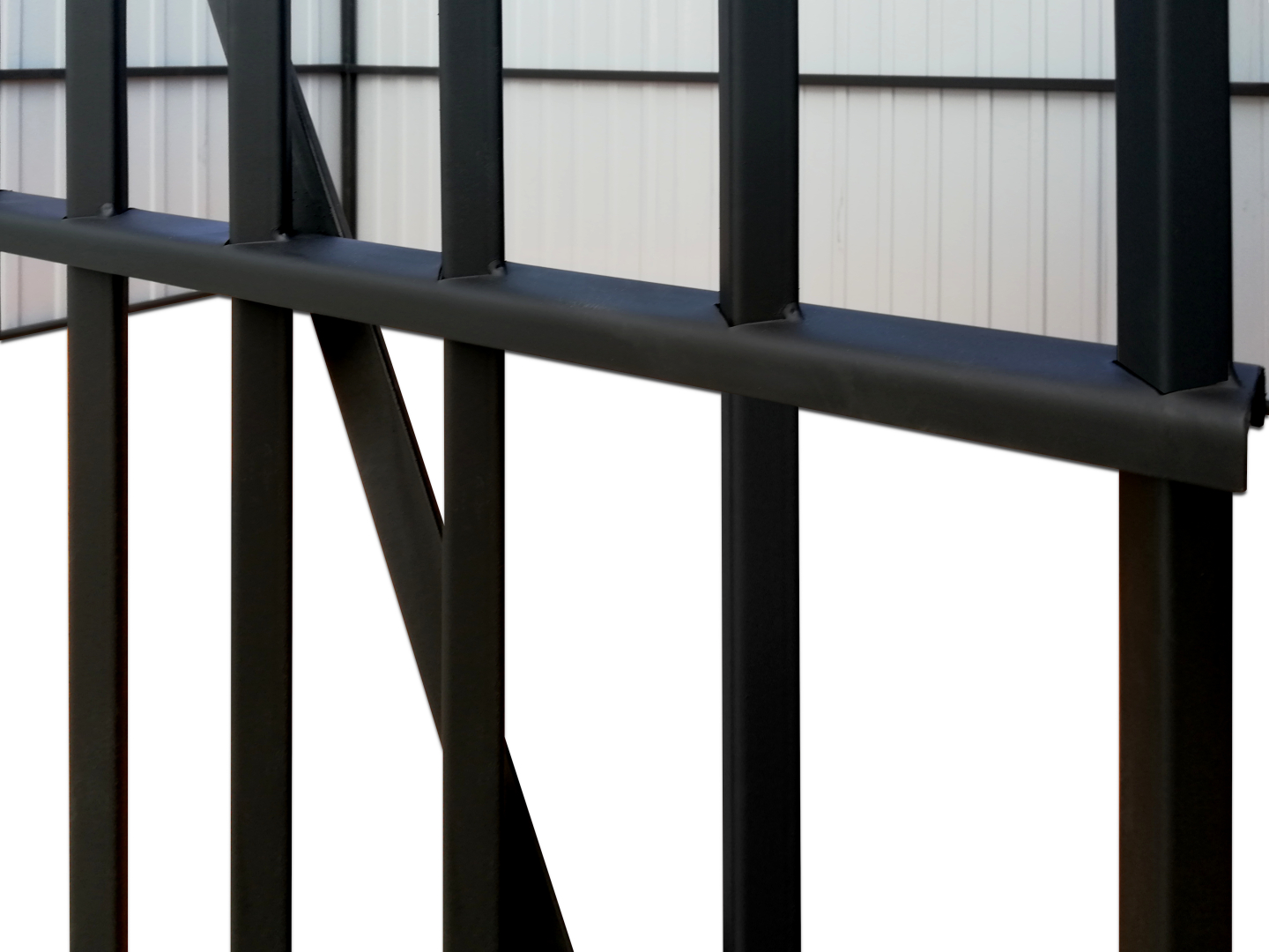 Konstrukcja z profilu ocynkowanego – kojec wykonany z kwadratowych, pomalowanych na czarno profili ocynkowanych, zawijanych-niezgrzewanych o wymiarze 20x20 mm. Dodatkowo kojec posiada wzmocnienie poziome z ceownika ocynkowanego. Odstępy między profilami wynoszą około 8,5 cm.