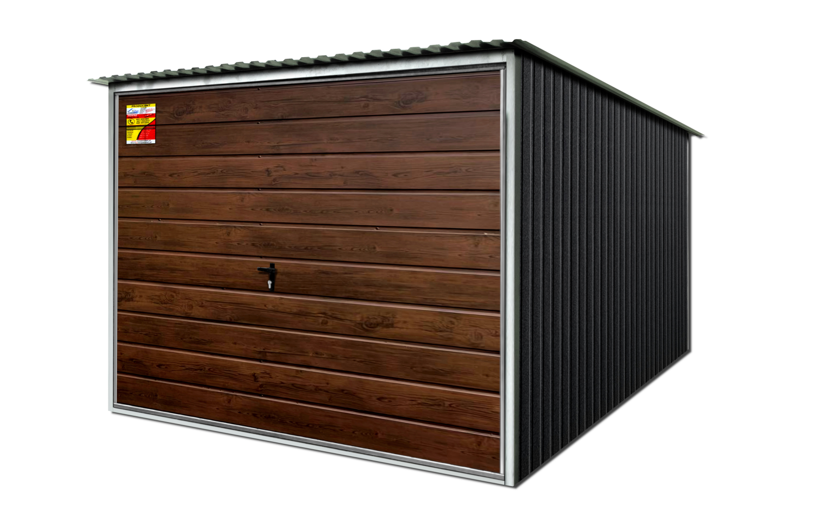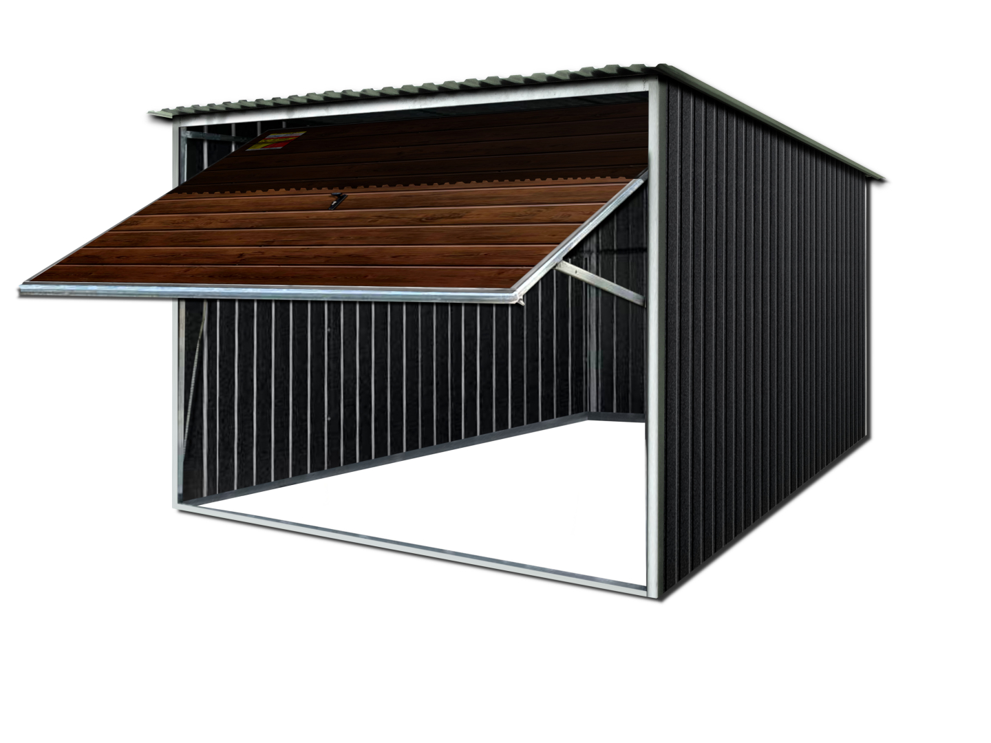 Garaż blaszany 4X6 LUX – Spad dachu do tyłu, drewnopodobna brama uchylna