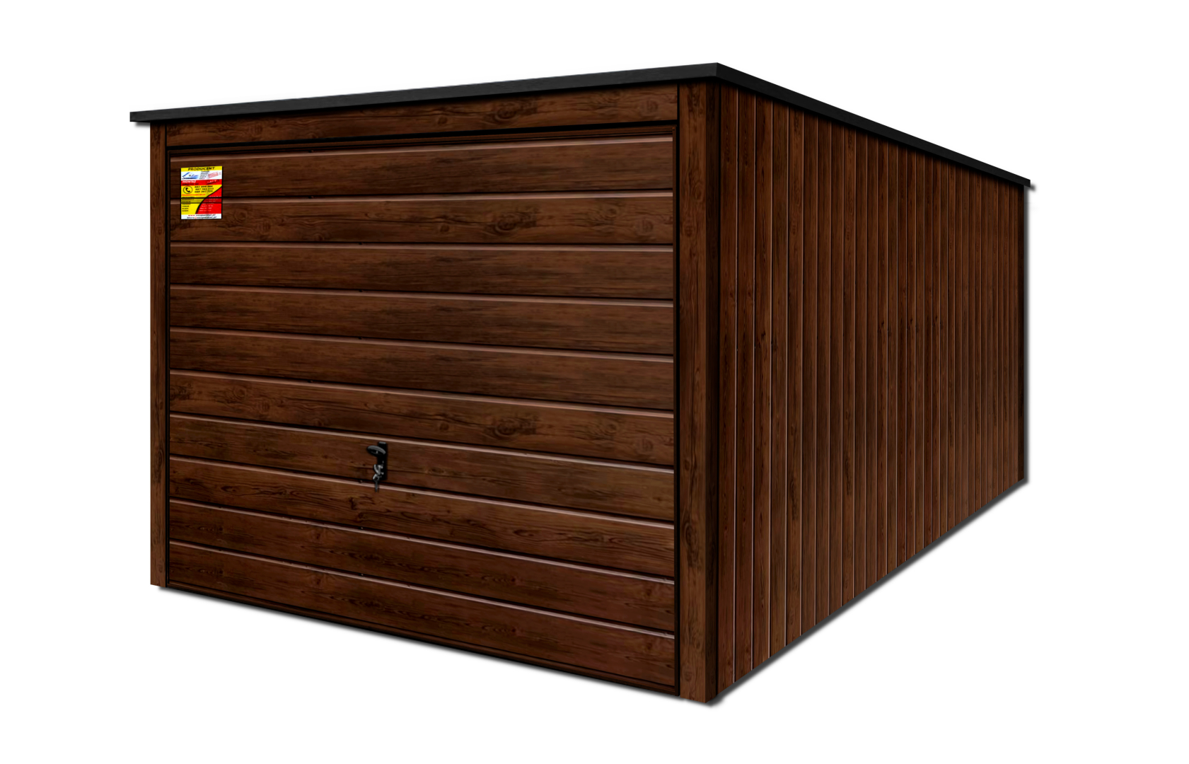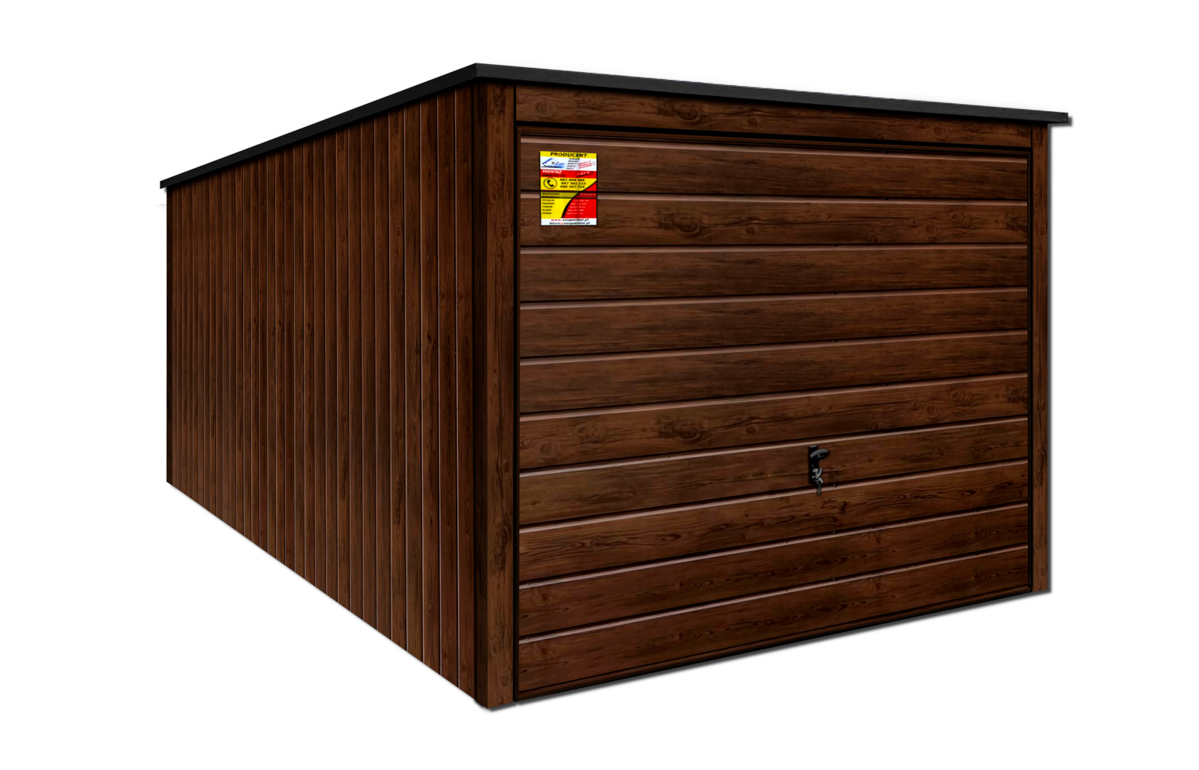 Garaż blaszany 3X5 LUX drewnopodobny – Spad dachu do tyłu, brama uchylna