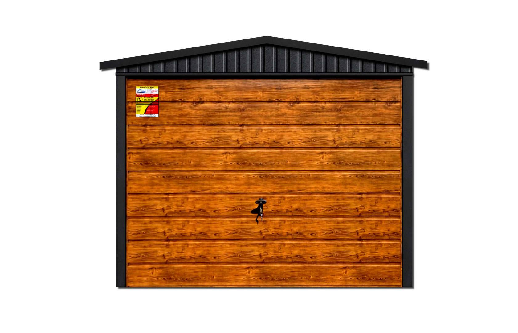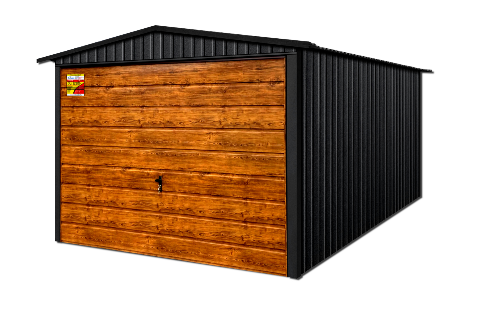 Garaż blaszany 5X9 LUX – Dwuspadowy dach, drewnopodobna brama uchylna