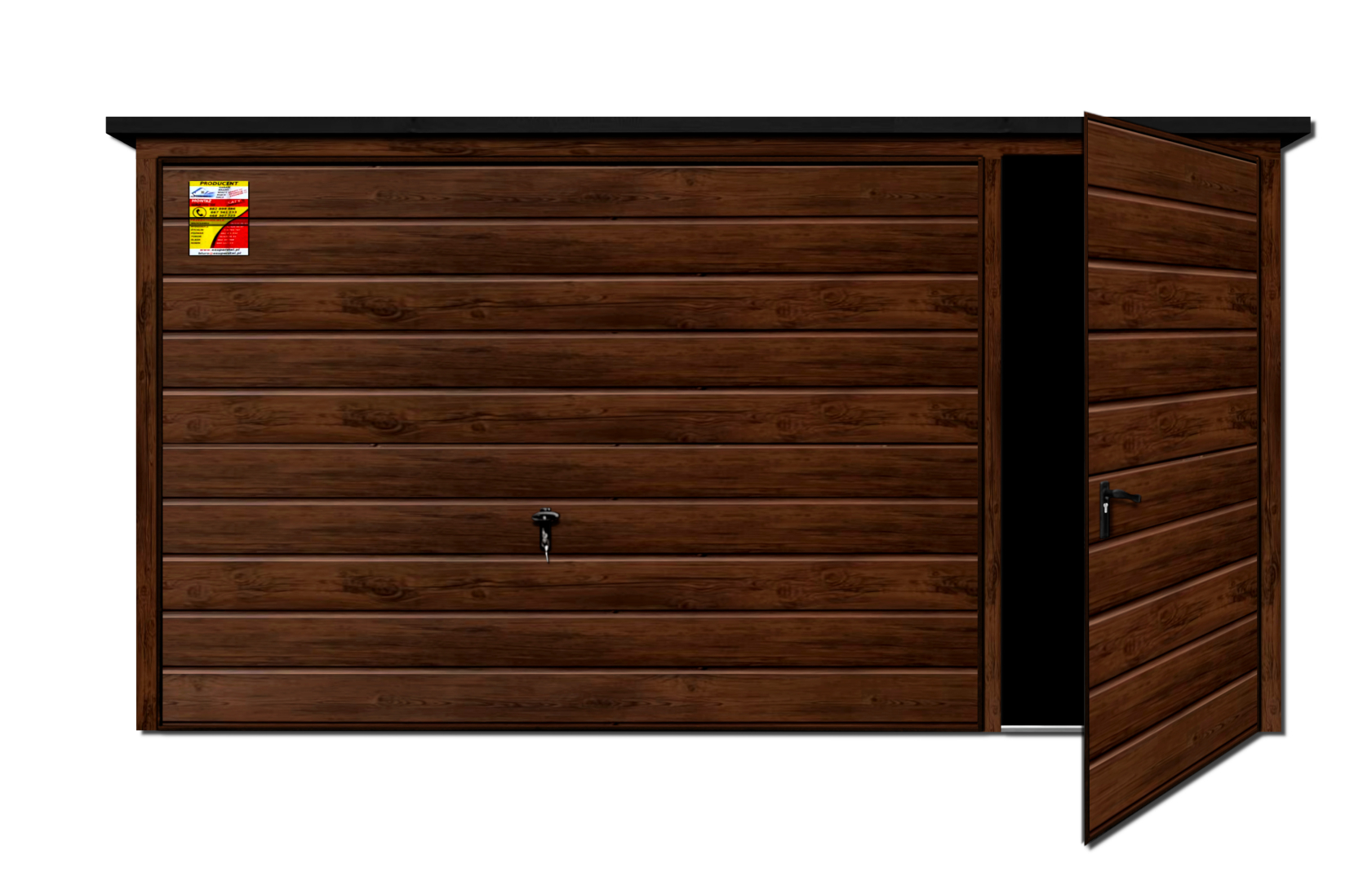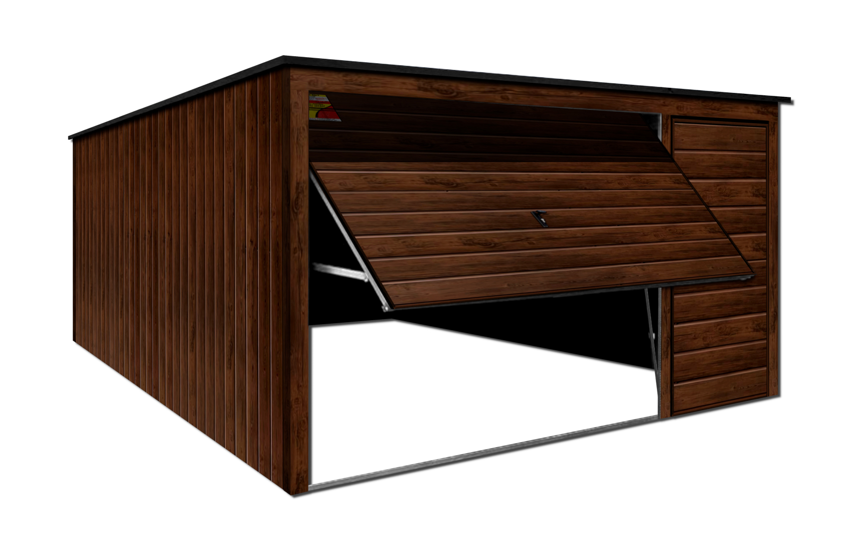GARAŻ DREWNOPODOBNY LUX 4X5 – SPAD DACHU DO TYŁU, BRAMA UCHYLNA, DRZWI, OKUCIA BLACHARSKIE DACHU I NAROŻNIKÓW