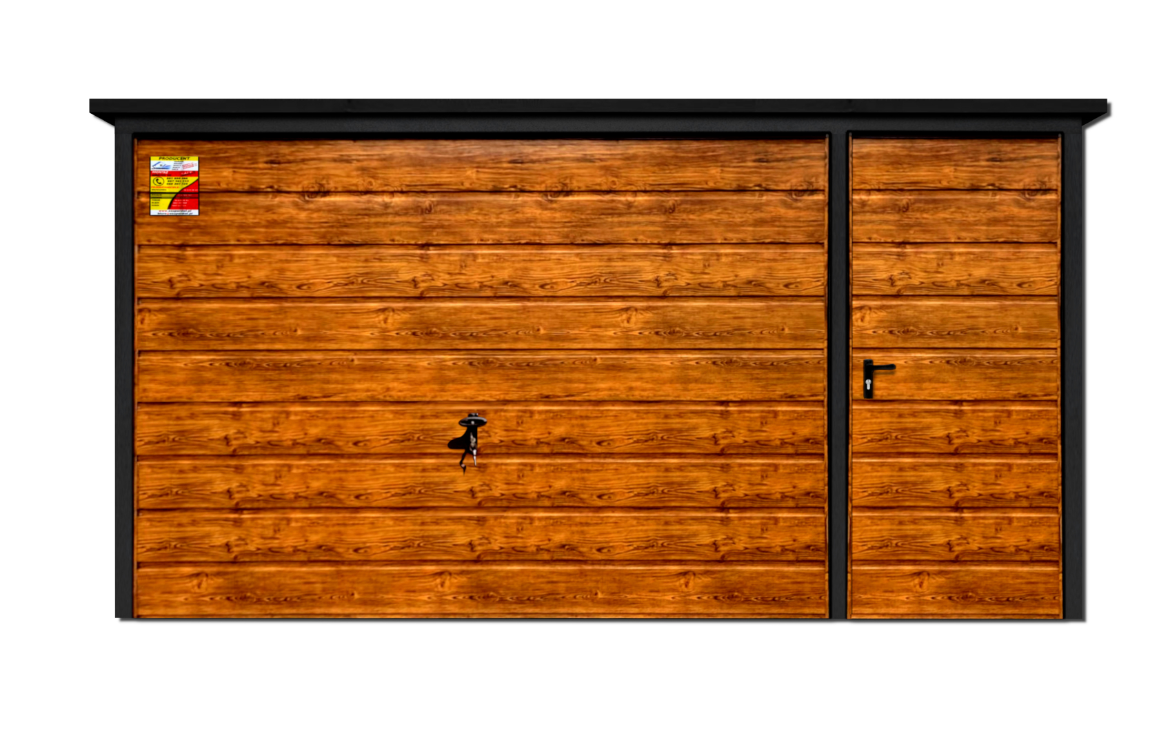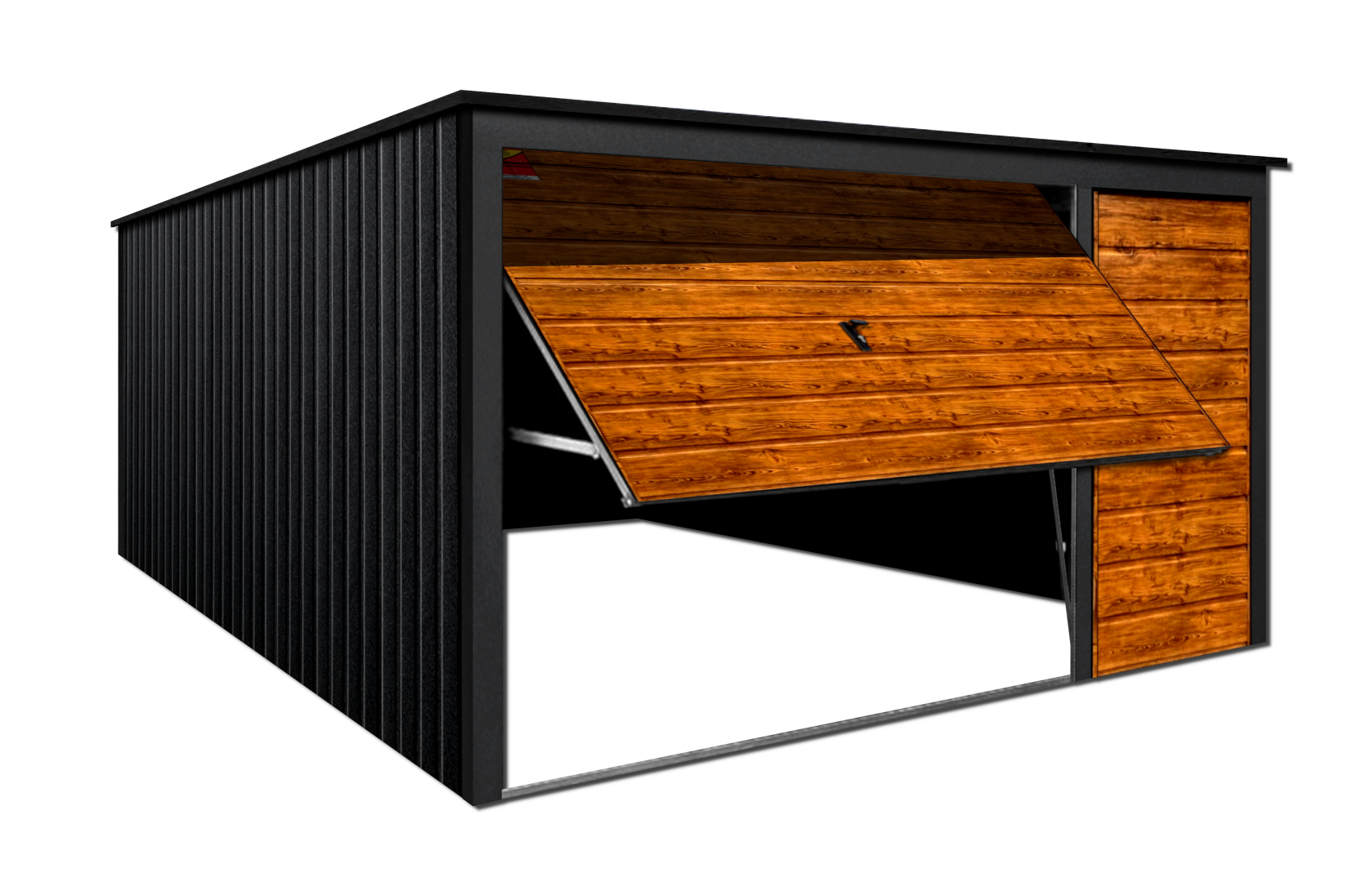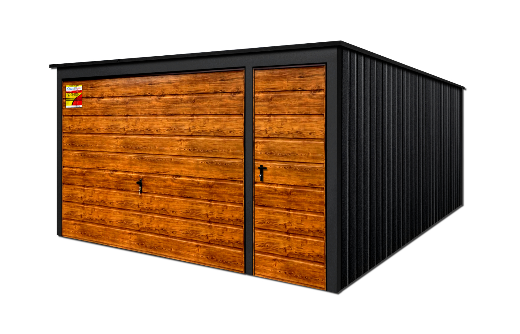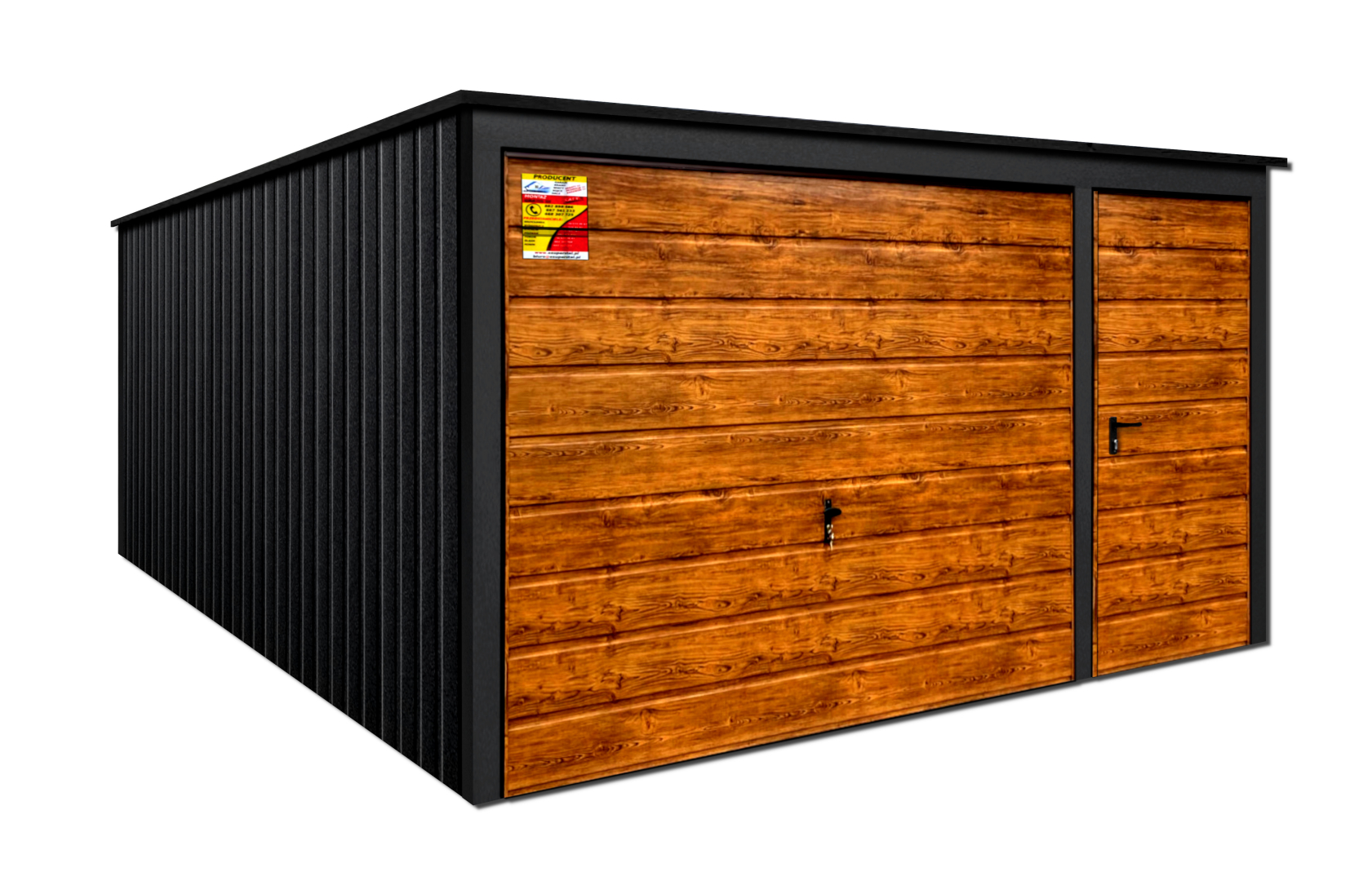 GARAŻ LUX 4X5 – SPAD DACHU DO TYŁU, DREWNOPODOBNA BRAMA UCHYLNA, DRZWI, OKUCIA BLACHARSKIE DACHU I NAROŻNIKÓW