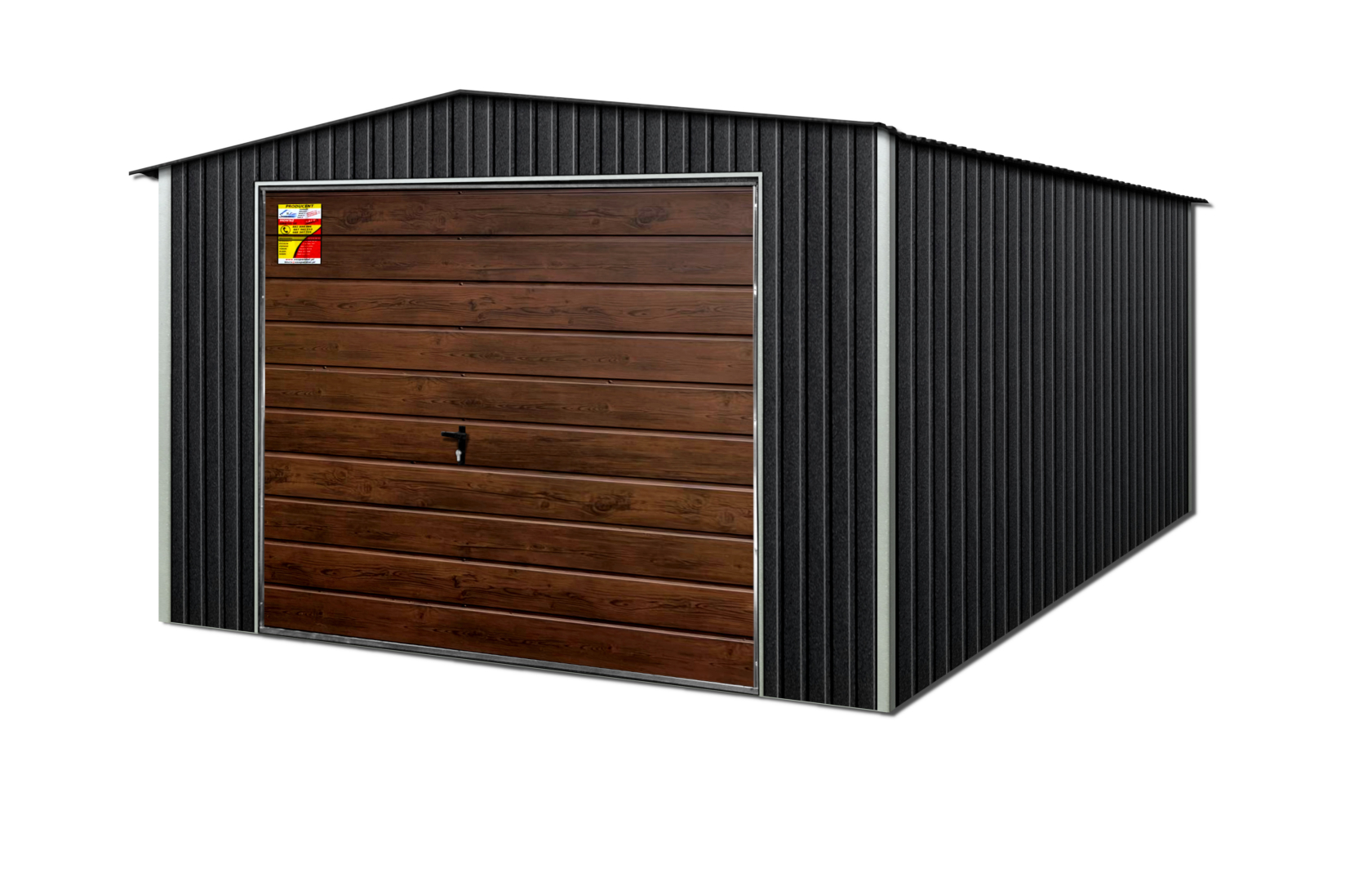 Garaż blaszany 2X5 LUX – Dwuspadowy dach, drewnopodobna brama uchylna