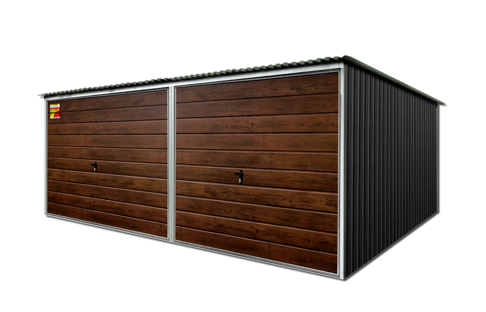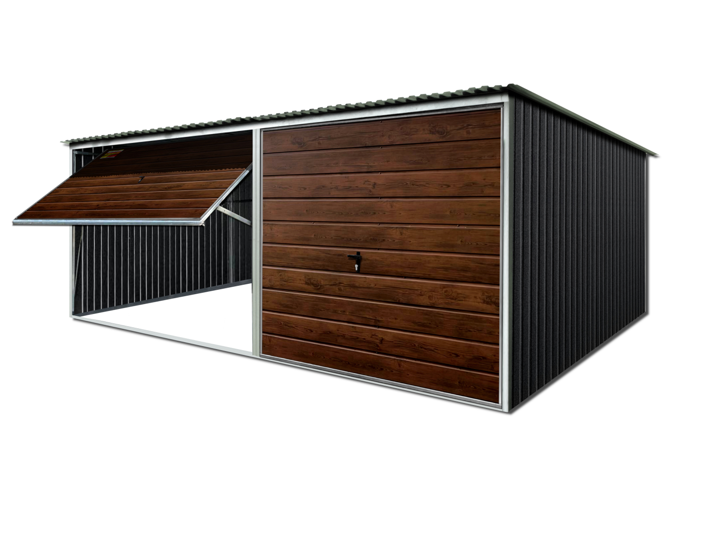GARAŻ LUX 6X5 – SPAD DACHU DO TYŁU, DREWNOPODOBNE BRAMY UCHYLNE, KONSTRUKCJA OCYNKOWANA