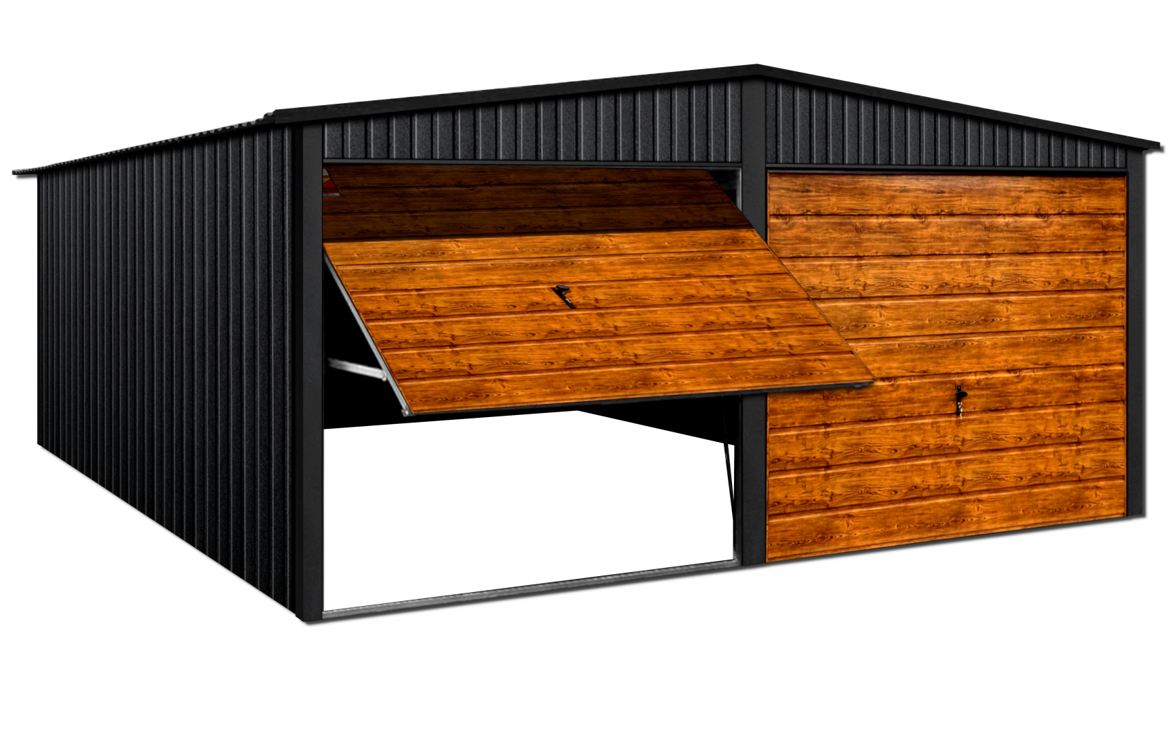 Garaż blaszany 4X5 LUX drewnopodobny – Dwuspadowy dach, brama uchylna