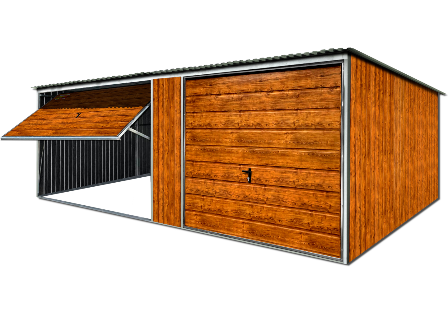 Garaż blaszany 7X9 LUX drewnopodobny – Dwuspadowy dach, bramy uchylne
