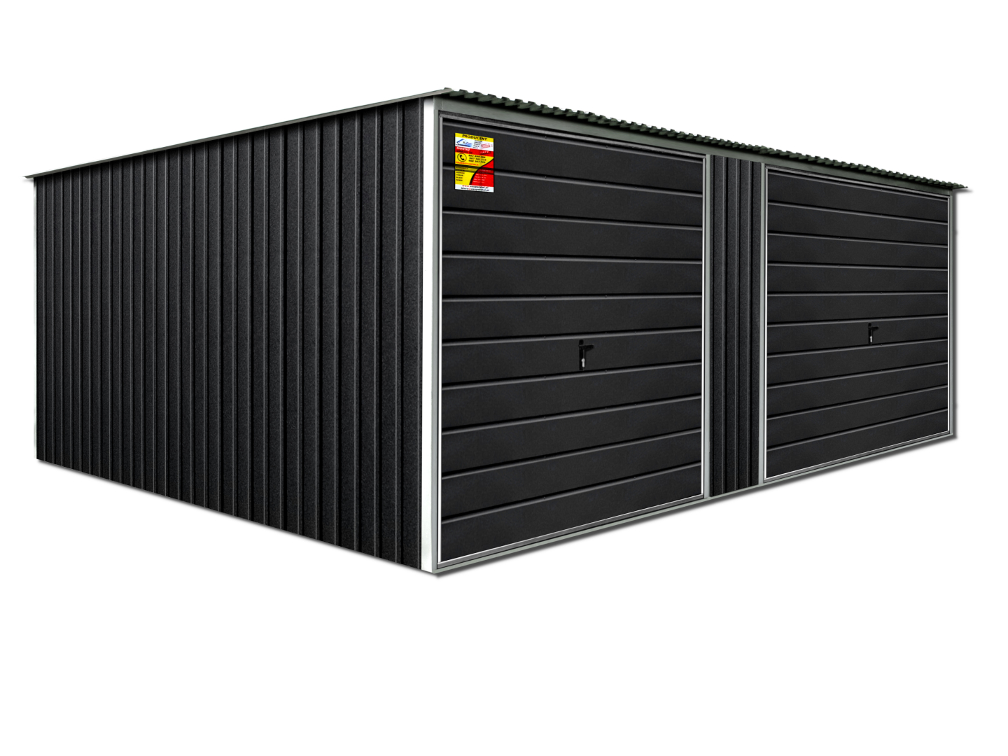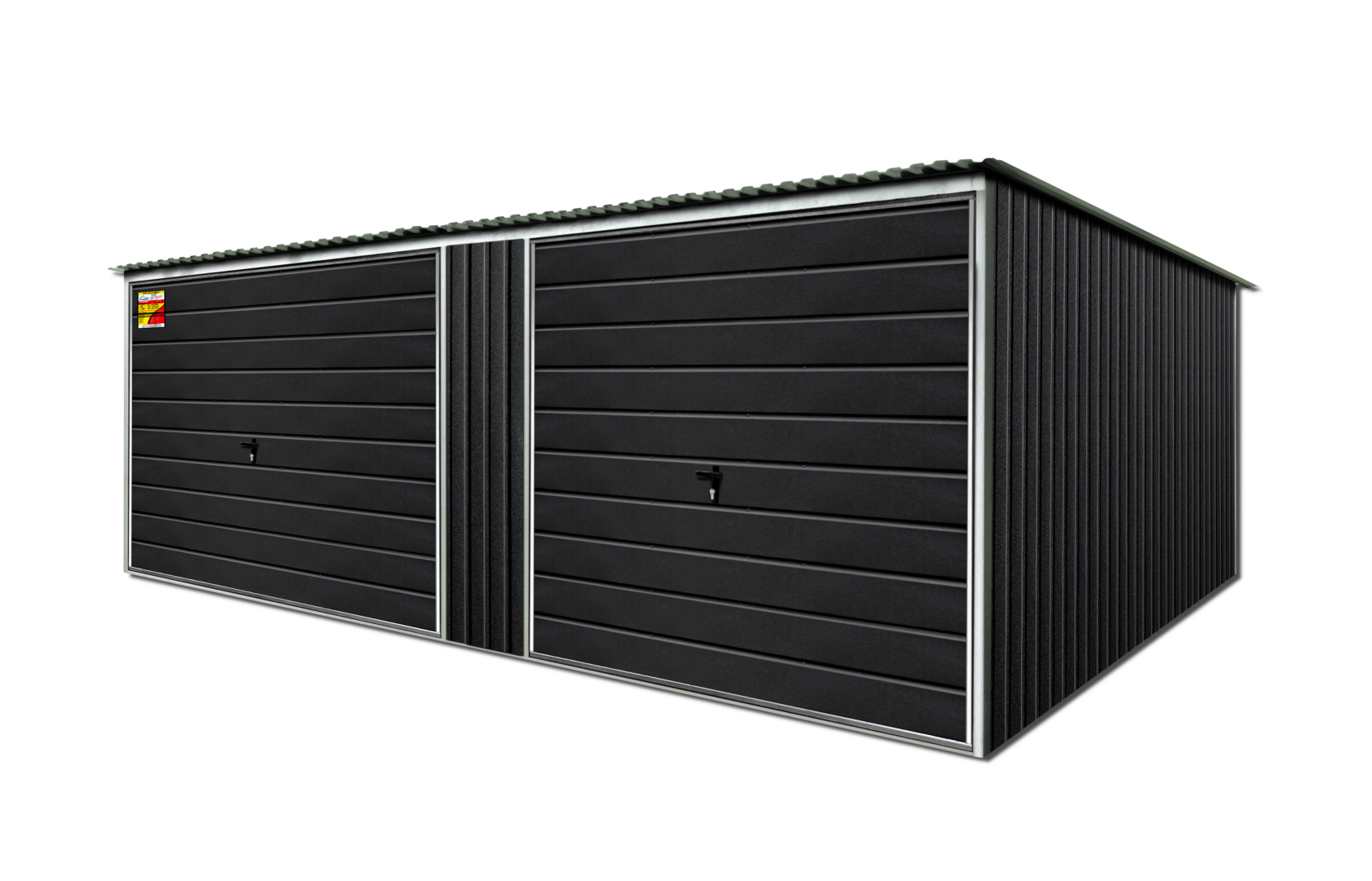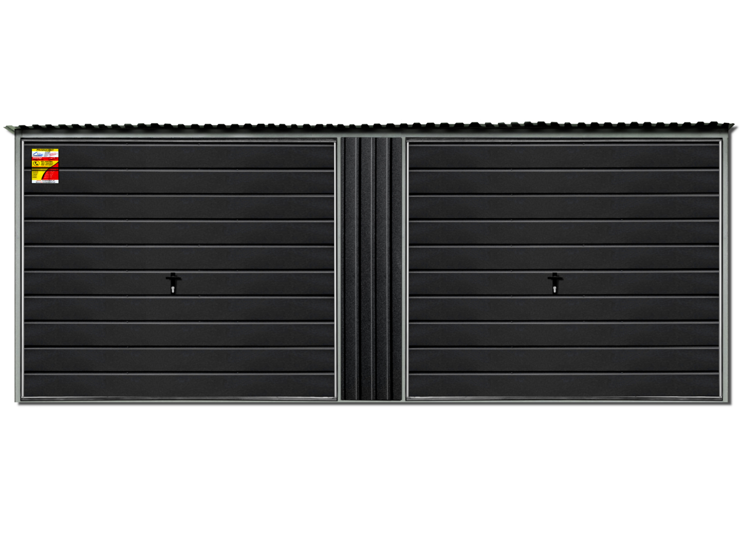 Garaż blaszany 4X4 LUX – Dwuspadowy dach, brama uchylna, grafit mat