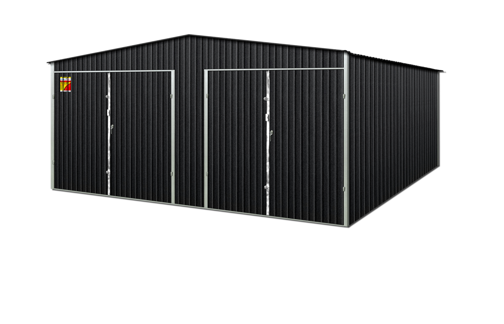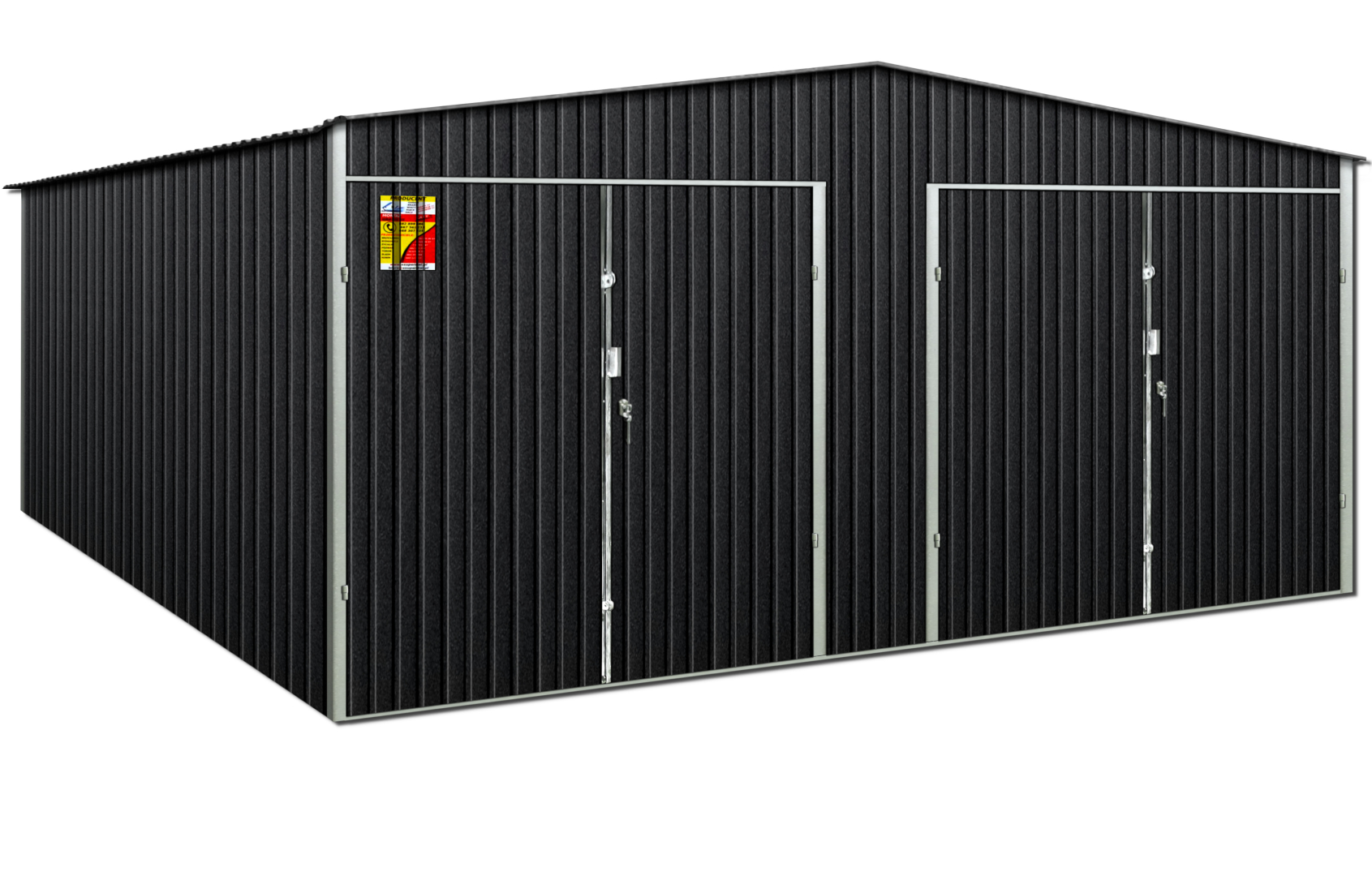 GRAFITOWY GARAŻ BLASZANY 7X7 – DWUSPADOWY DACH, BRAMY DWUSKRZYDŁOWE, KONSTRUKCJA OCYNKOWANA