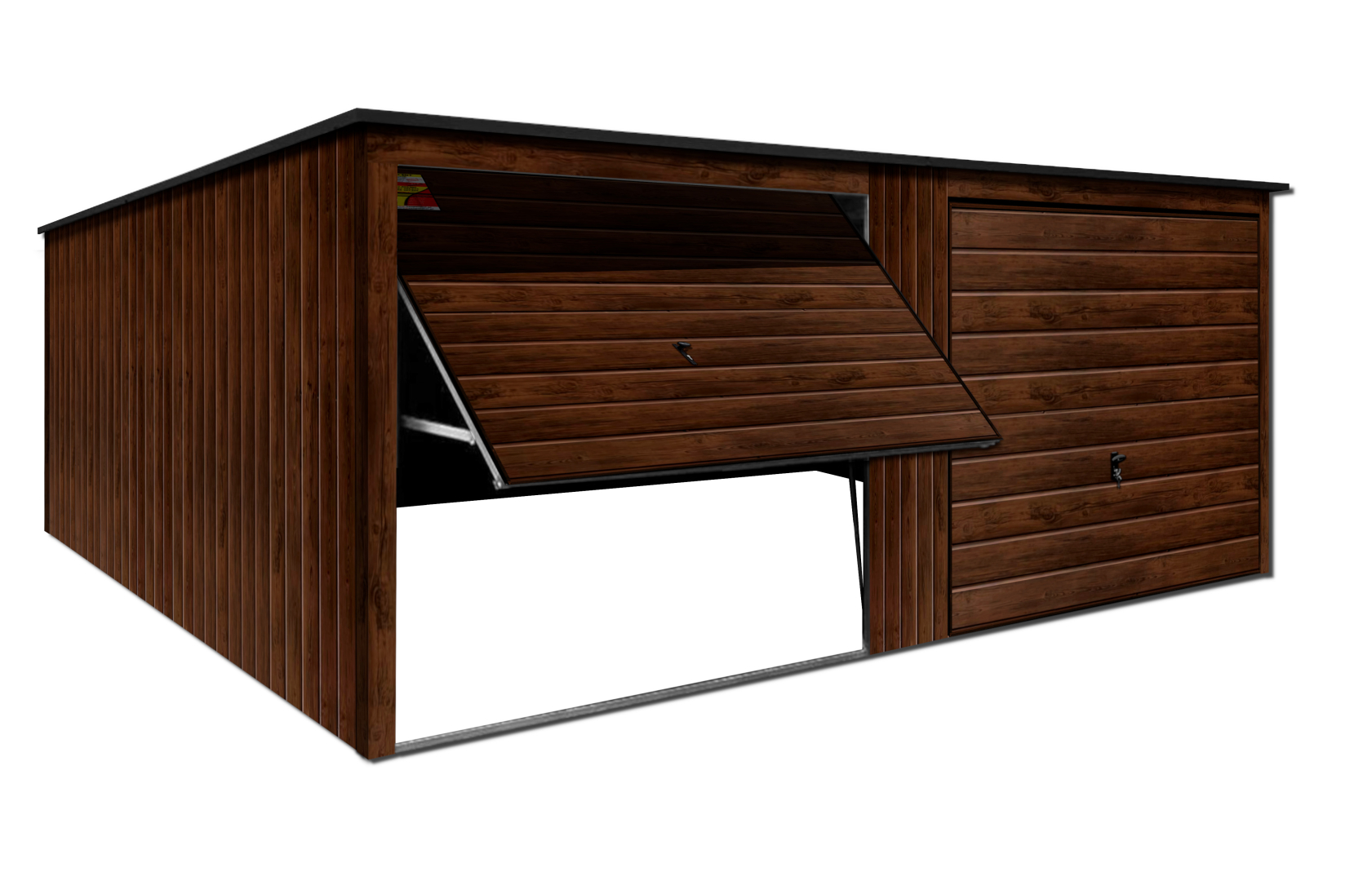 Garaż blaszany 7X7 LUX drewnopodobny – Spad dachu do tyłu, bramy uchylne