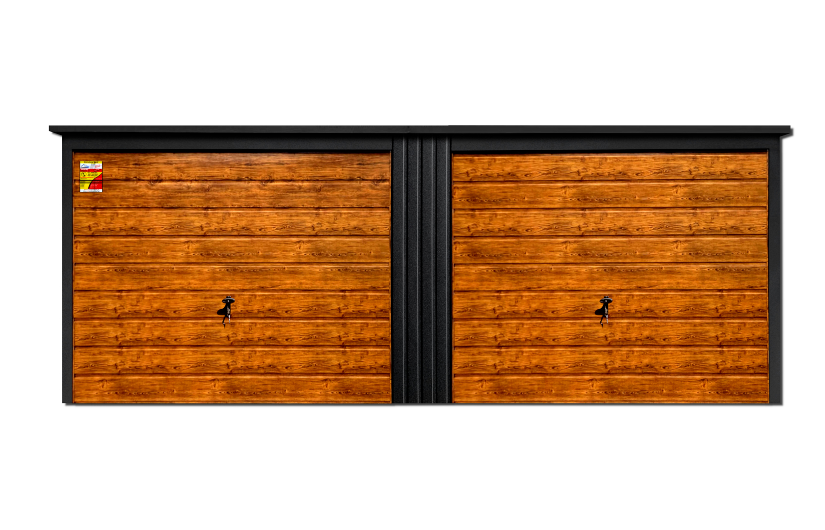 Garaż blaszany 5X7 LUX drewnopodobny – Dwuspadowy dach, brama uchylna