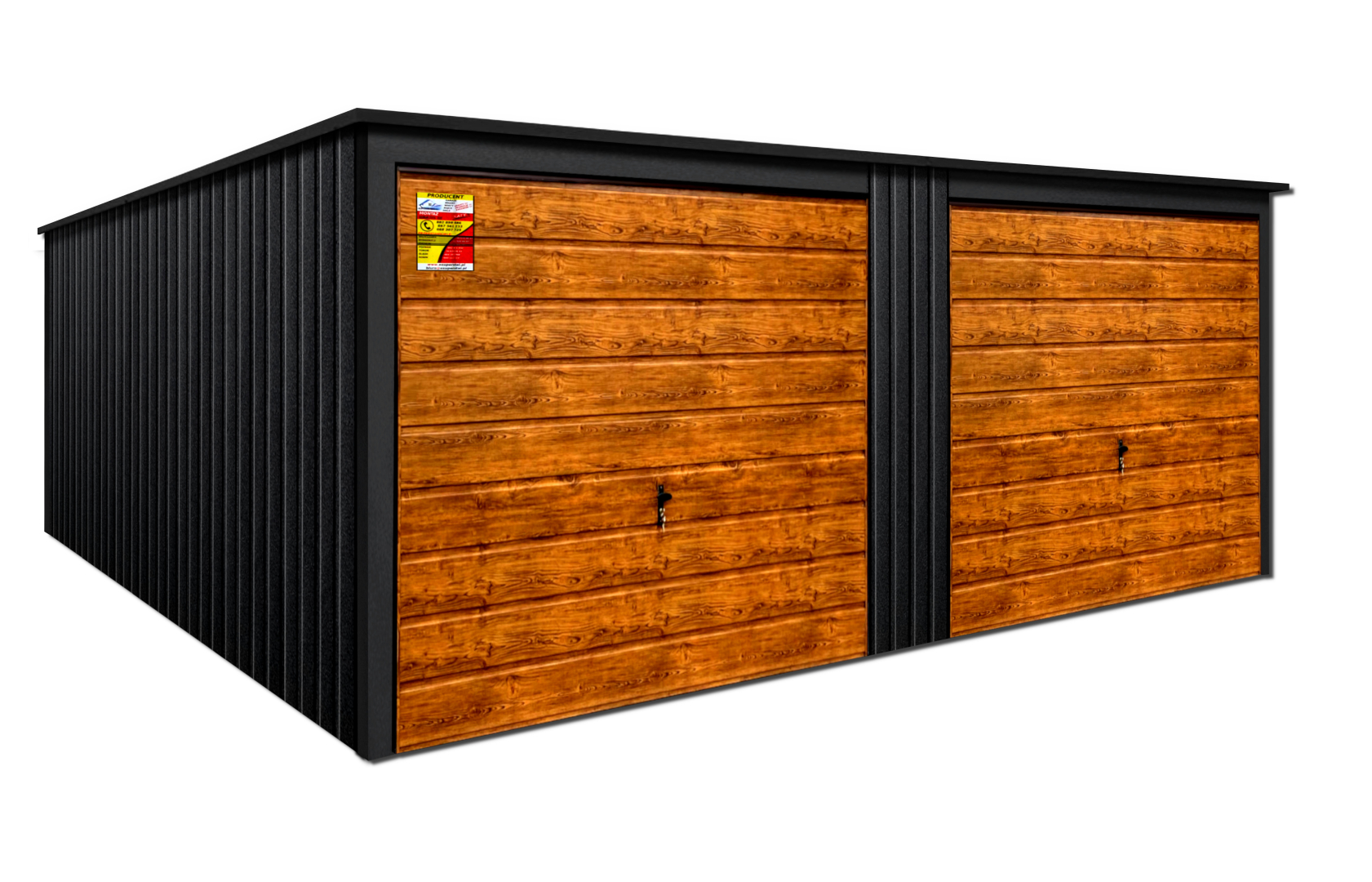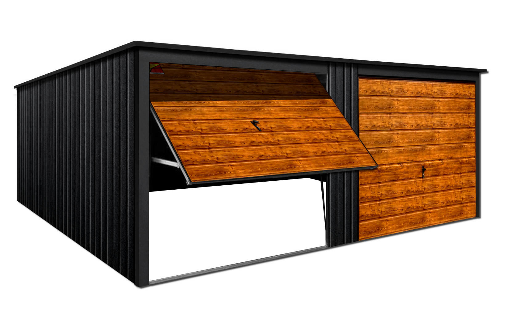 Garaż blaszany 7X9 LUX drewnopodobny – Dwuspadowy dach, brama uchylna