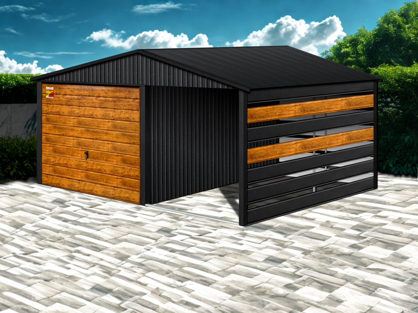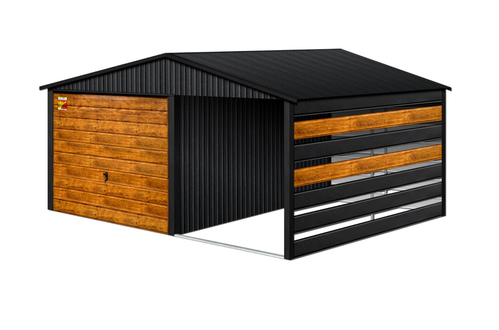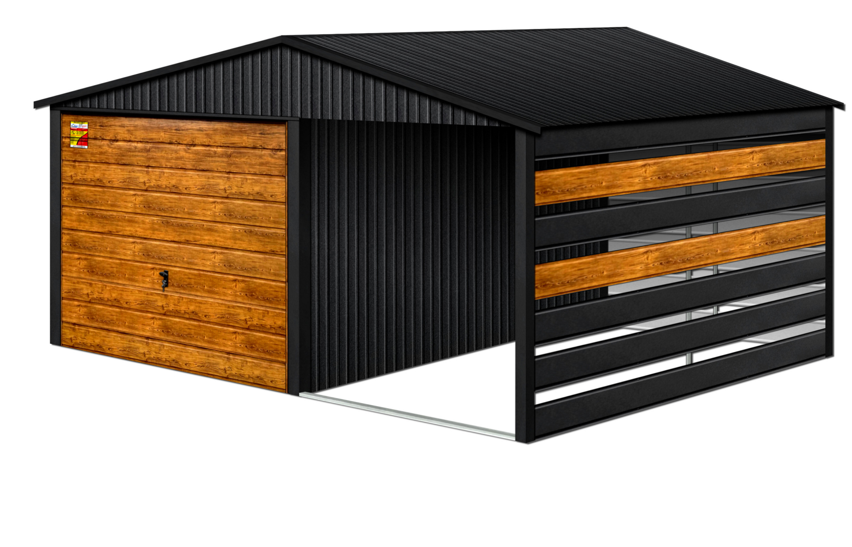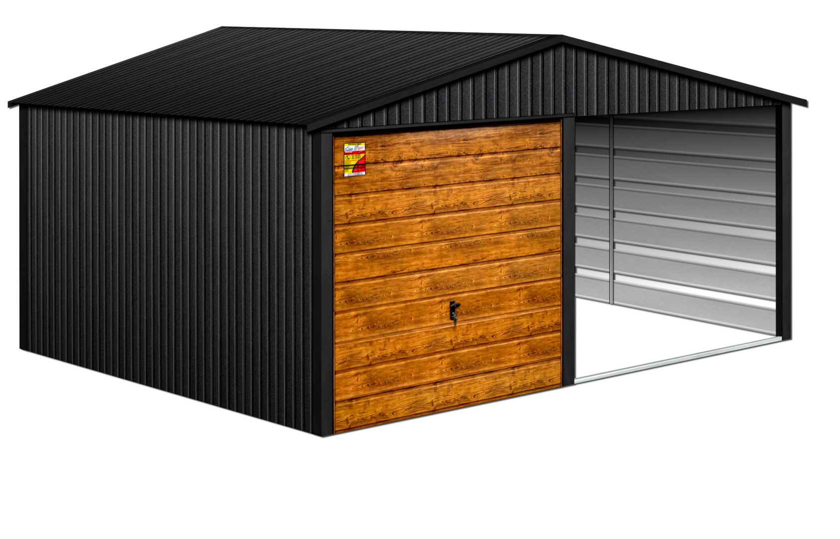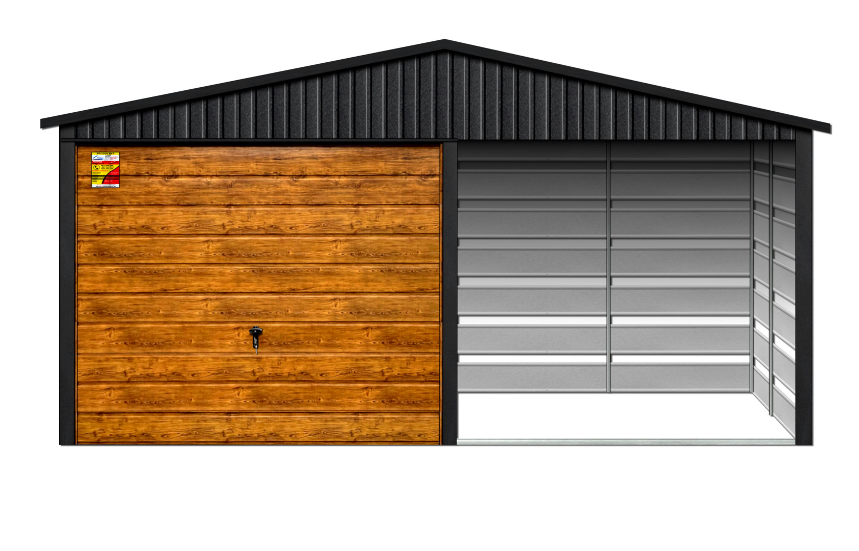 GARAŻ LUX 4X8 Z WIATĄ SMK – DWUSPADOWY DACH, BRAMA UCHYLNA SOSNA, OKUCIA BLACHARSKIE DACHU I NAROŻNIKÓW