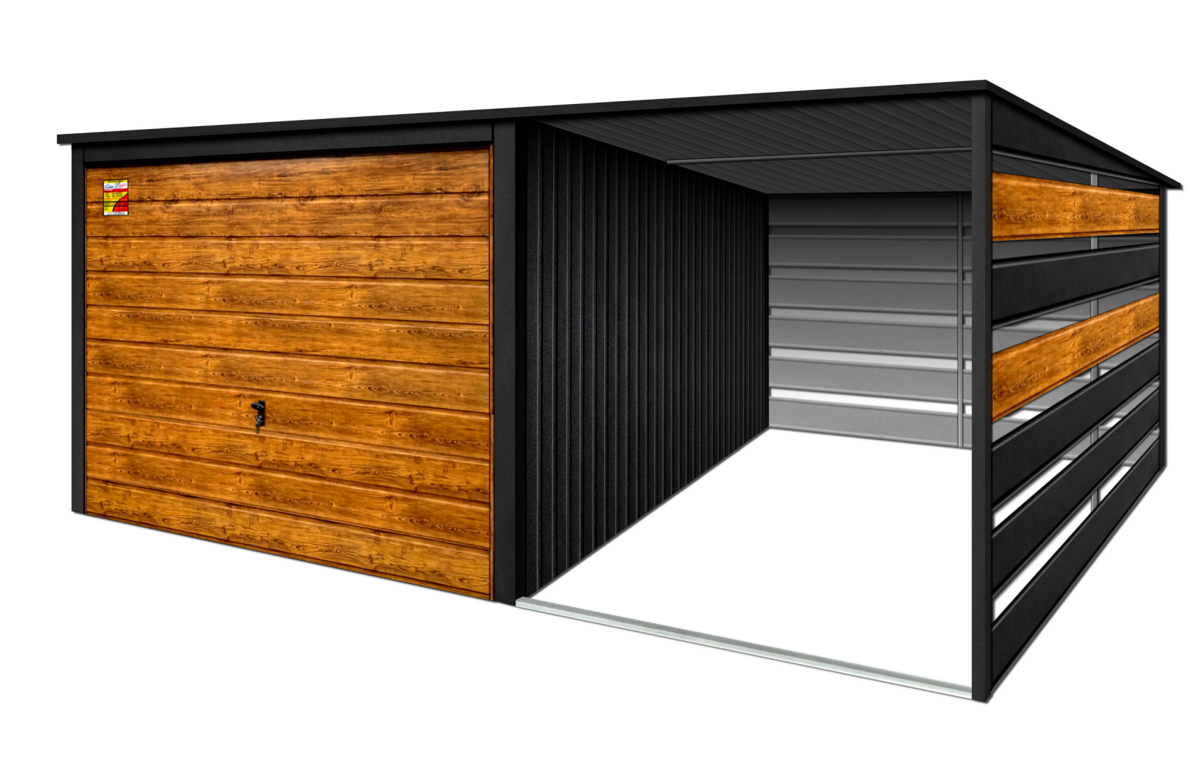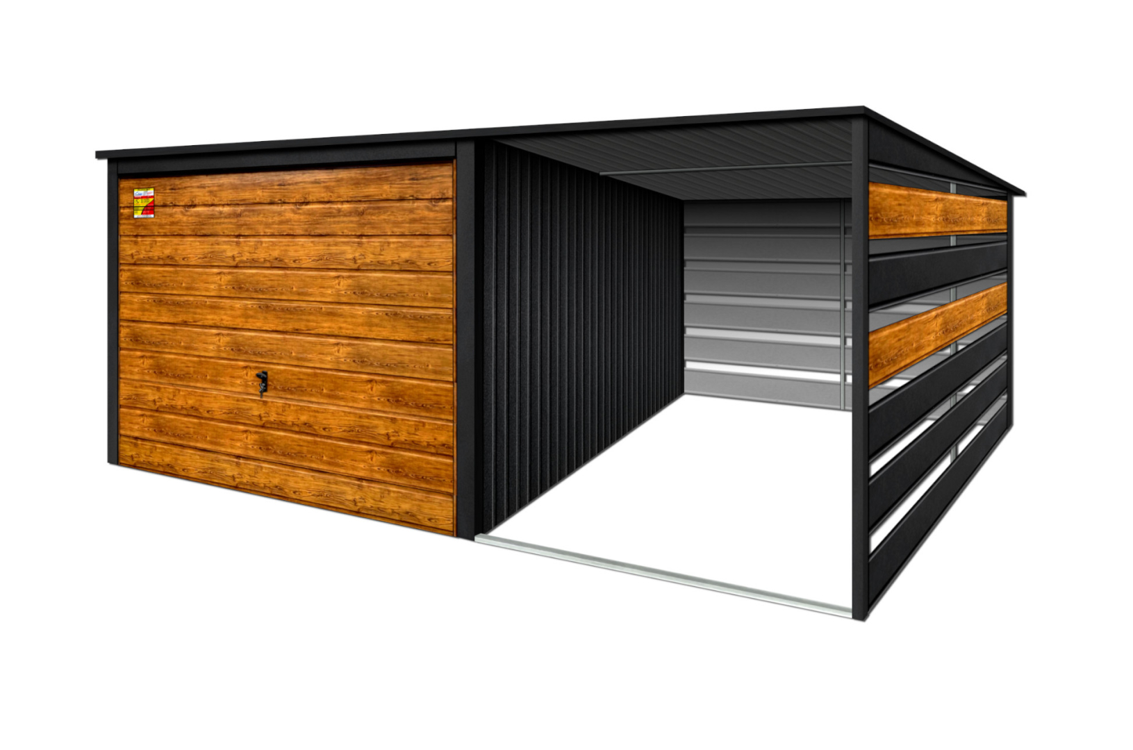 GARAŻ LUX 5X6 Z WIATĄ SMK – SPAD DACHU DO TYŁU, BRAMA UCHYLNA SOSNA, OKUCIA BLACHARSKIE DACHU I NAROŻNIKÓW