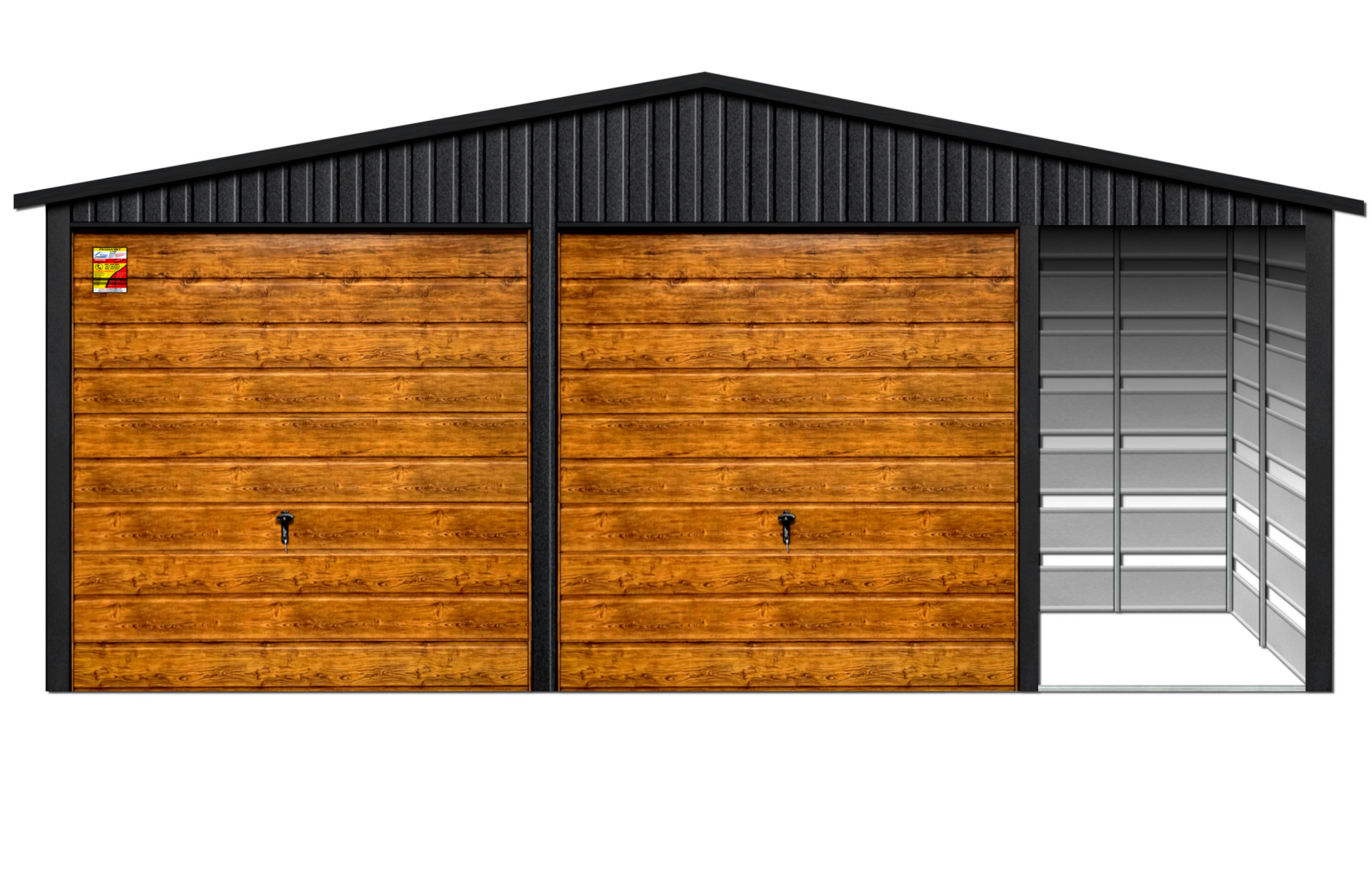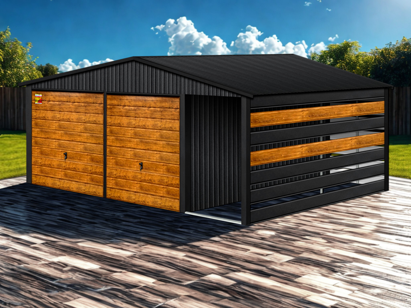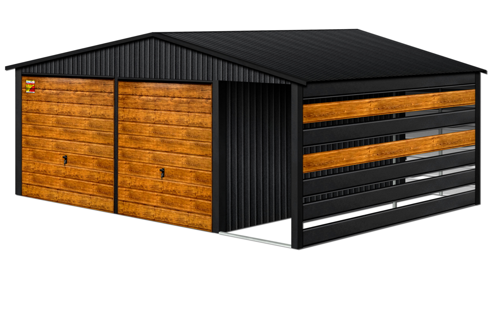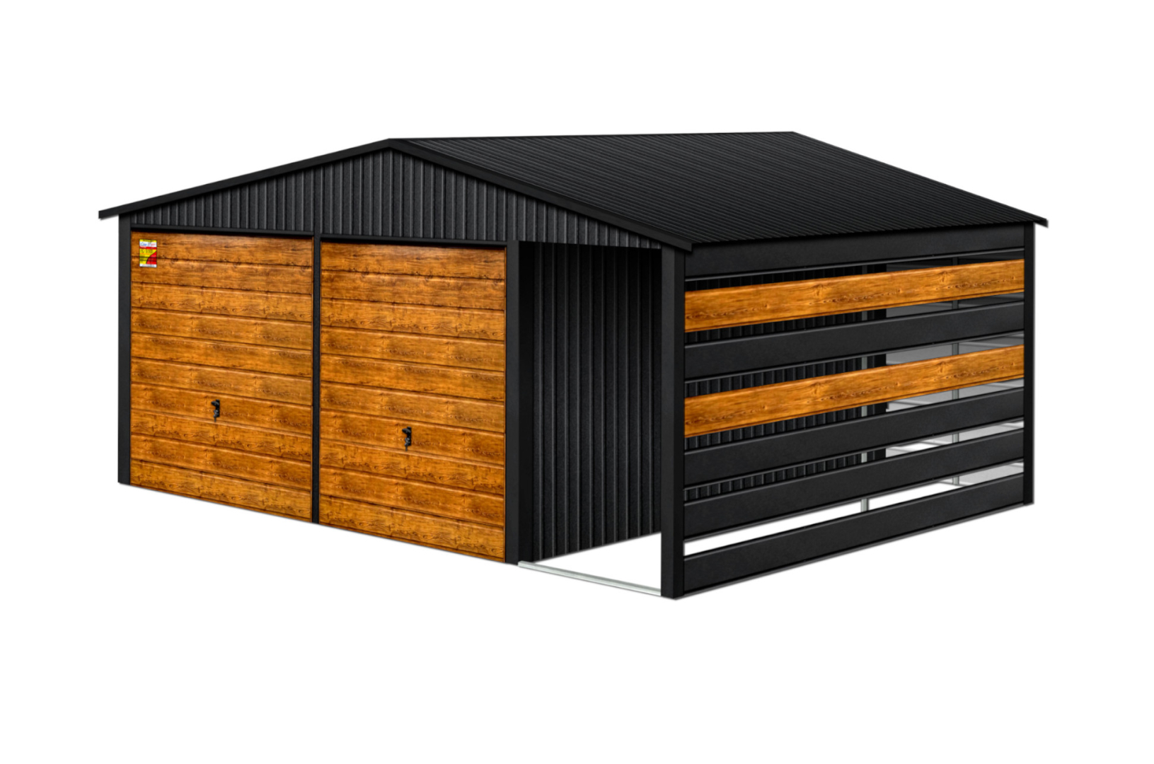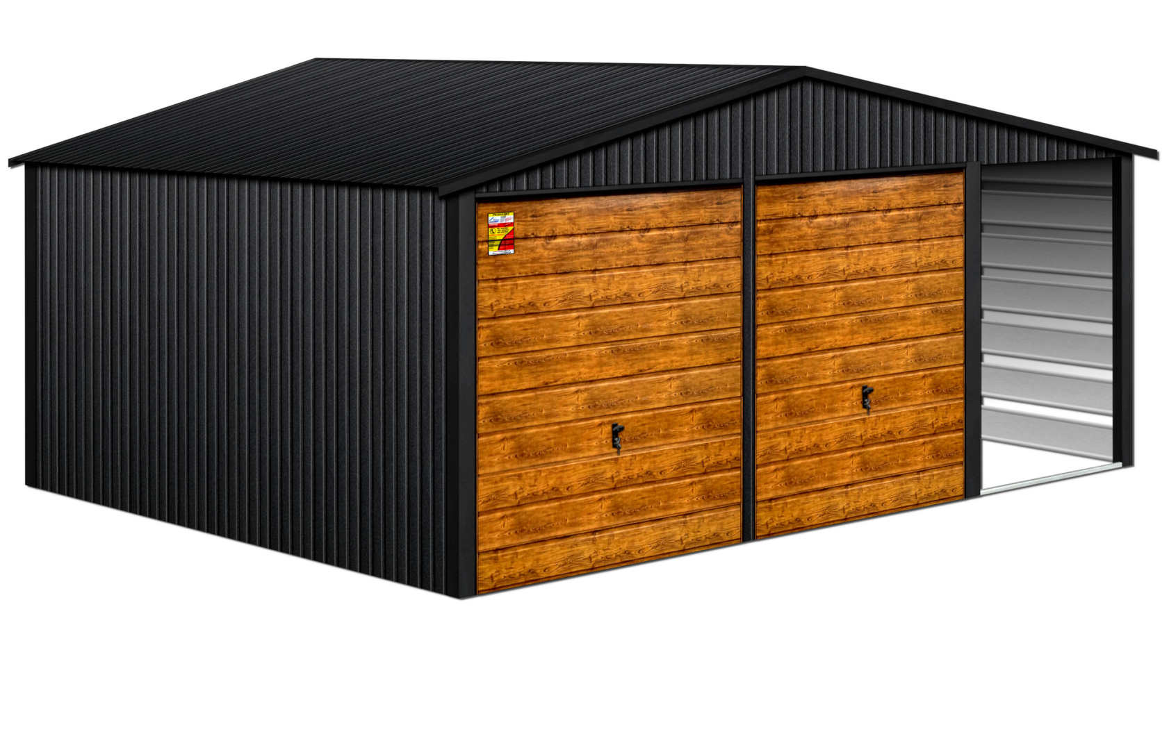 GARAŻ LUX 8X6 Z WIATĄ SMK – DWUSPADOWY DACH, BRAMY UCHYLNE SOSNA, OKUCIA BLACHARSKIE DACHU I NAROŻNIKÓW
