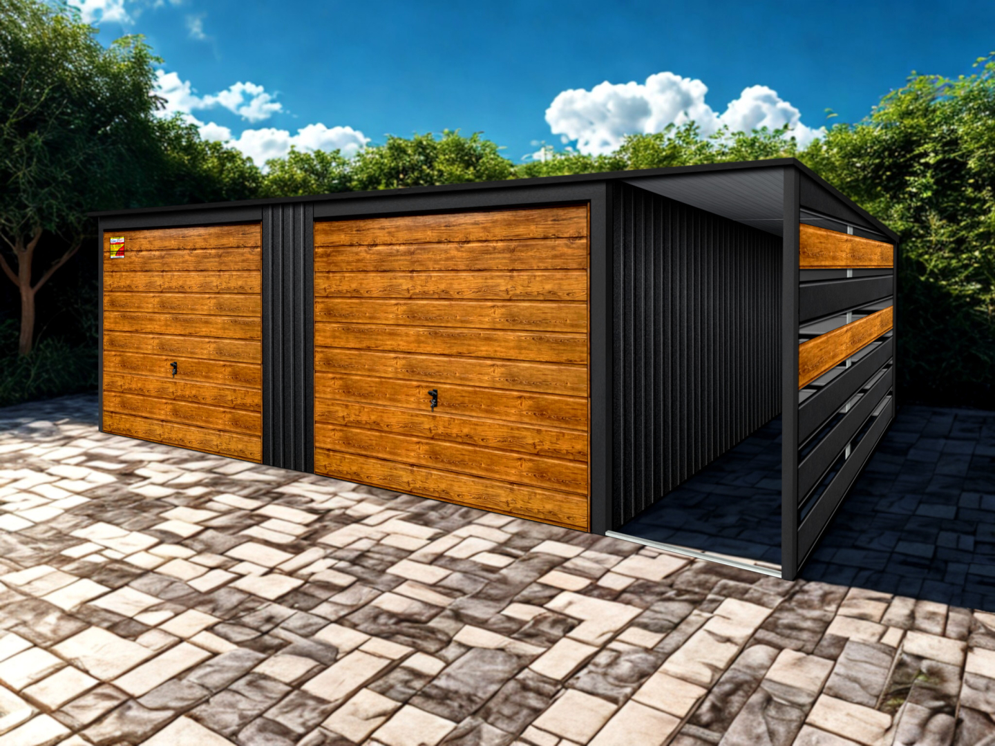- dwie bramy uchylne w panelu poziomym szerokie – kolor drewnapodobny SOSNA