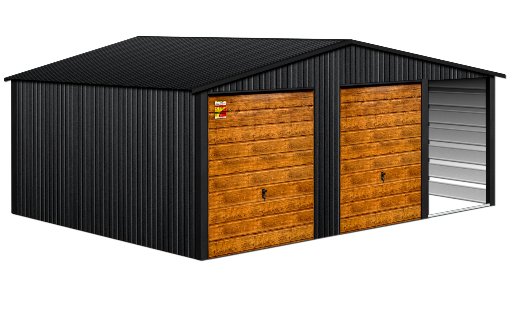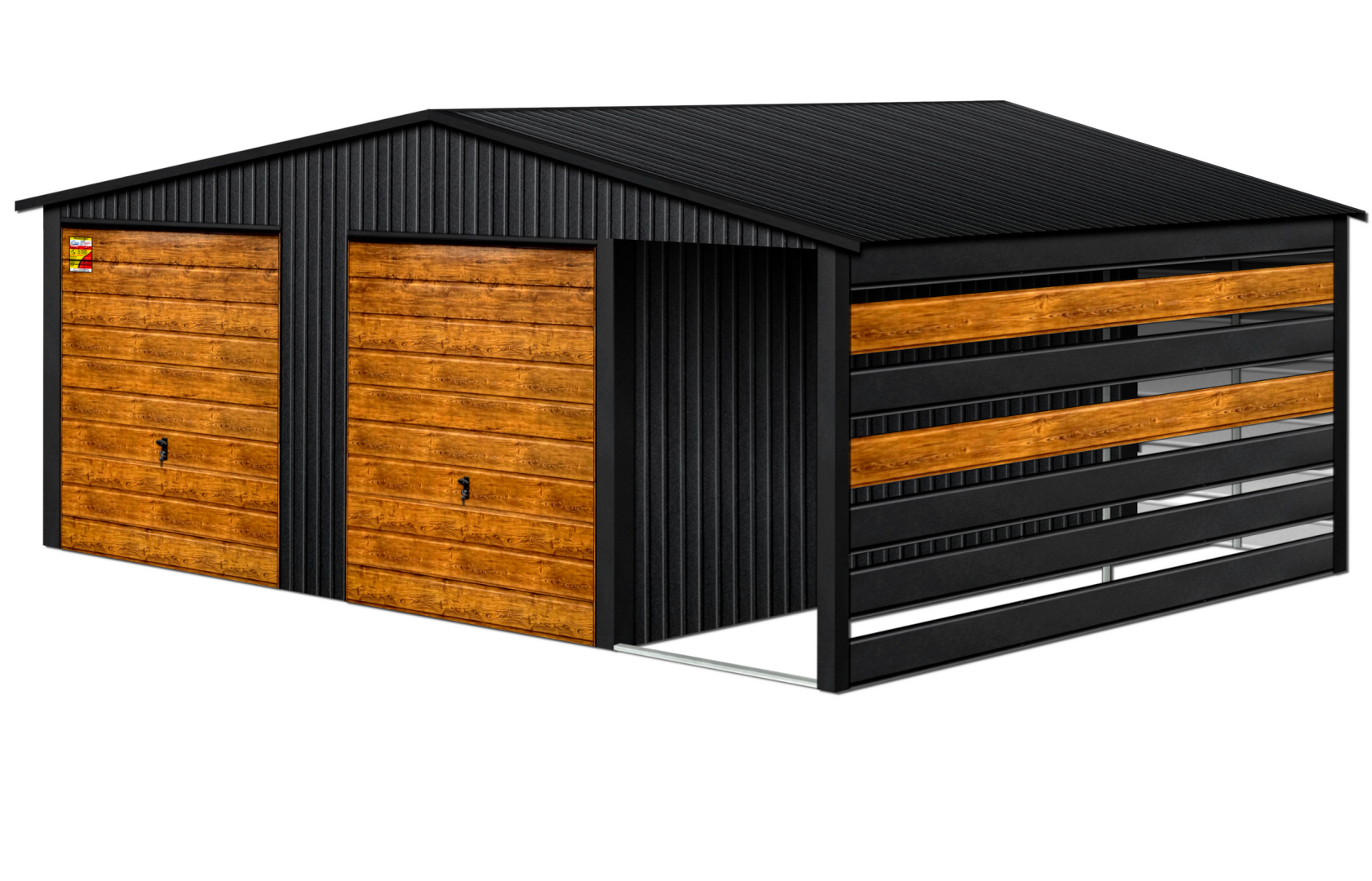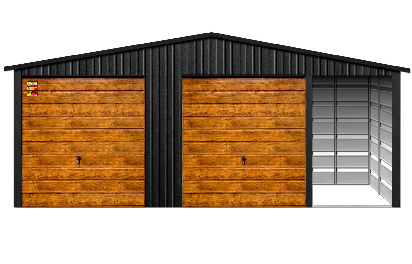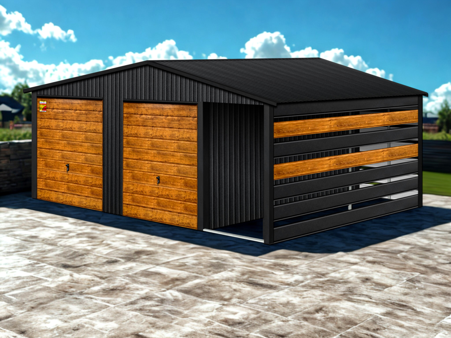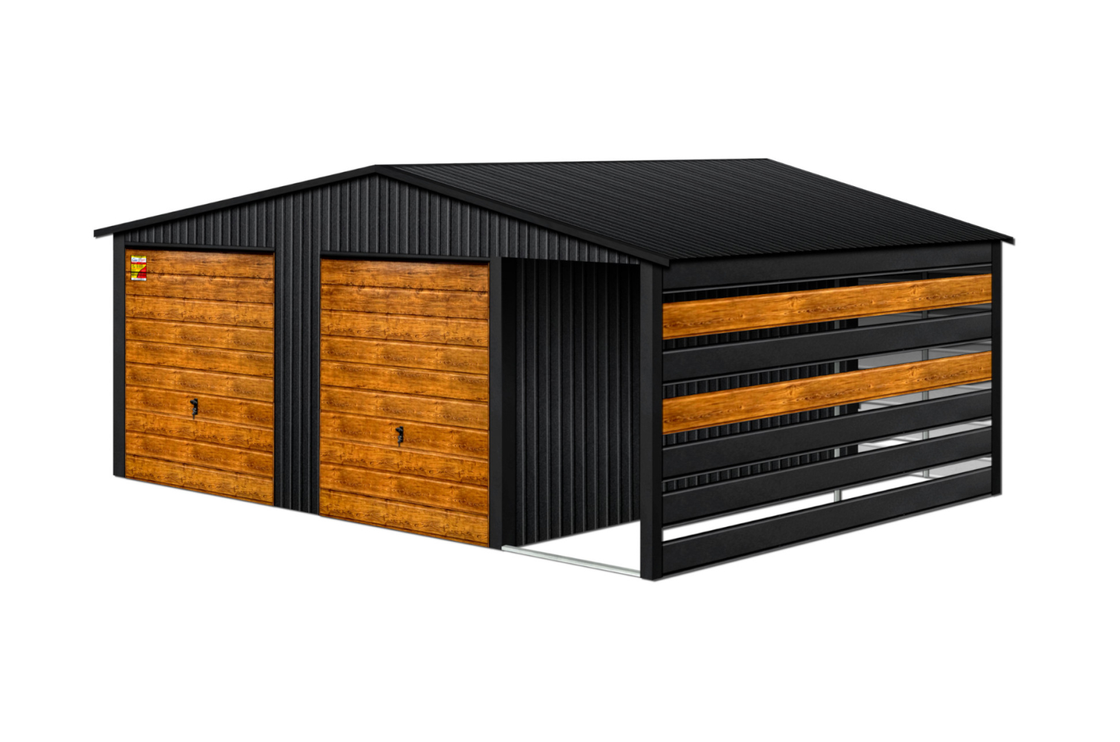 GARAŻ LUX 9X8 Z WIATĄ SMK – DWUSPADOWY DACH, BRAMY UCHYLNE SOSNA, OKUCIA BLACHARSKIE DACHU I NAROŻNIKÓW