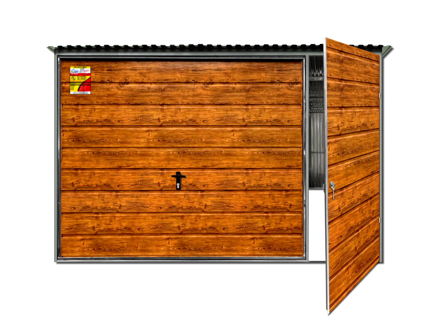 - ściany, drzwi oraz brama pokryte blachą w kolorze drewnopodobnym - ZŁOTY DĄB